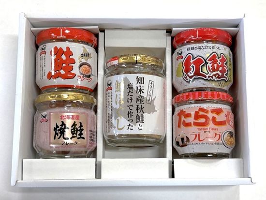 知床の味覚5点セット(鮭フレーク/紅鮭ほぐし/焼鮭フレーク/たらこフレーク/秋鮭と塩だけで作った鮭ほぐし)