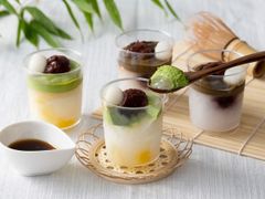 酸味の効いたフルーツがごろっと入った、わらび餅のようなもっちりとした食感のゼリーに、宇治抹茶と京都産のほうじ茶のクリーム、北海道産小豆のあんこ、もち米の風味を活かしたなめらかでモチモチの白玉をのせて、沖縄県産の黒糖を使用した黒蜜で仕上げました。各トッピングと少しずつ合わせて食べたり、全部すくって一緒に食べたり…食べ合わせを変えながらいろいろな味わい、食感をお楽しみください。<食で旅する>※詳しくは「詳細を見る」または「もっと見る」をクリック