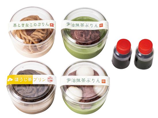 抹茶プリンと白玉プリンには抹茶みつを、栗ときな粉のプリンと宇治ほうじ茶プリンには黒みつを、お好みでかけてお召し上がりください。