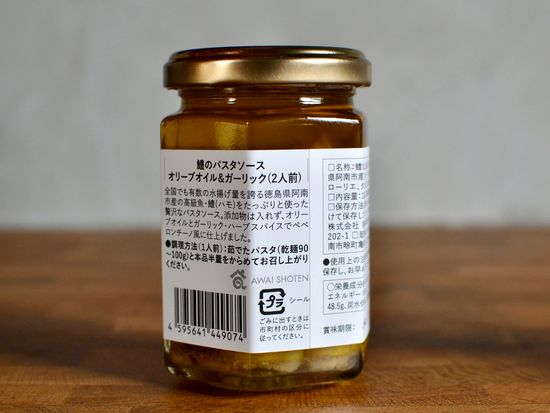 ■鱧のパスタソース オリーブオイル&ガーリック:鱧(徳島県阿南市産)、オリーブオイル、食塩、ニンニク、ローリエ、タカの爪、黒コショウ、唐辛子粉末