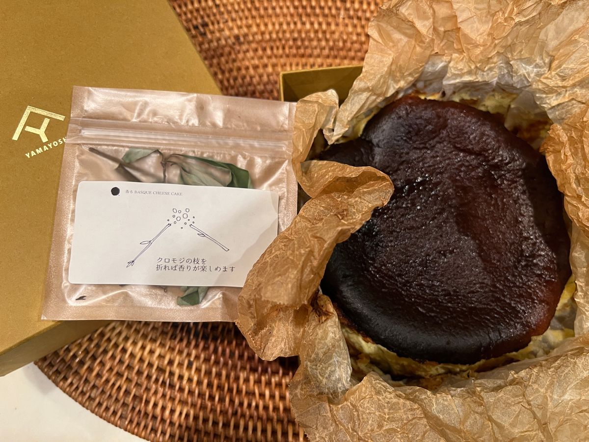 クロモジの香りが好きでお茶や焼酎を買ったことがありますが、初めてクロモジのバスクチーズケーキを買いました。凄く可愛い箱に入ってくるので、贈り物にも良さそうです。箱を開けると、上面が真っ黒でインパクト大ですが(笑)、クロモジの良い香りがします。濃厚で、包丁で切る時に生地が包丁にまとわりついてきます。我が家は気にしないので大丈夫ですが、お客様に出したりする時は一回一回包丁を拭いて切ったほうが良さそうです。