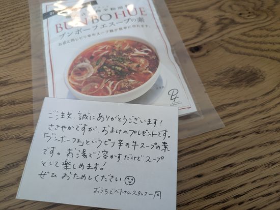 自宅にいながら、本格的なベトナムの味を楽しめる贅沢なお取り寄せでした。素材の新鮮さがしっかり感じられ、香りや味わいも現地さながら。温めるだけで手軽に完成するのに、満足感はレストランクオリティで驚きました。さらに、心遣いの感じられるプレゼントまで同梱されていて、箱を開けた瞬間から嬉しい気持ちに。特別な日の食事やギフトにもぴったりだと思います。ありがとうございました。