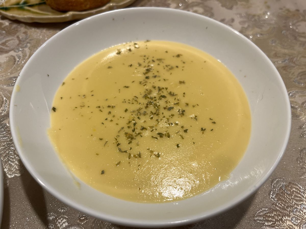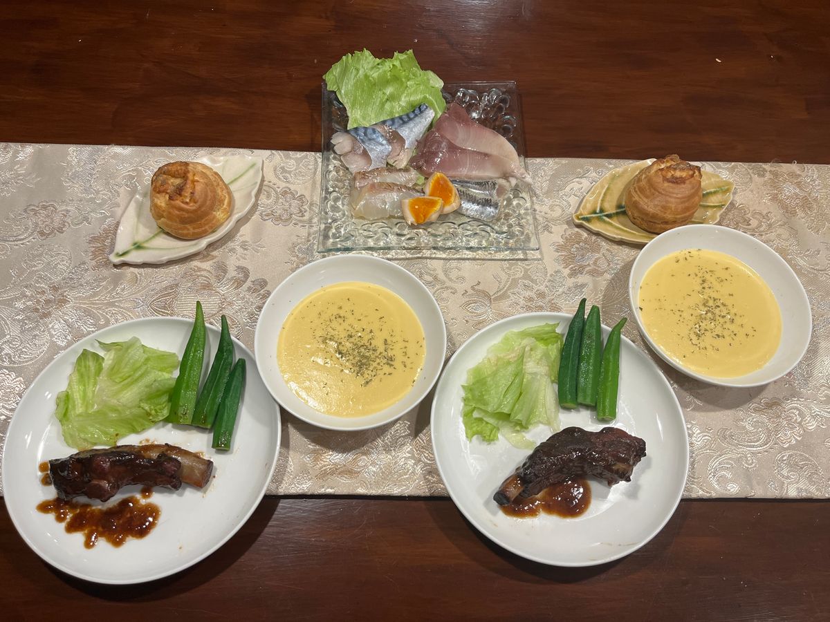 金華さばや真鯛など4種のカルパッチョは普段自宅では出て来ない前菜でテンションが上がります。スープはまさにイメージどおりの”お店でいただく洋食のコーンポタージュ”という感じで、みんな好きなお味だと思います。