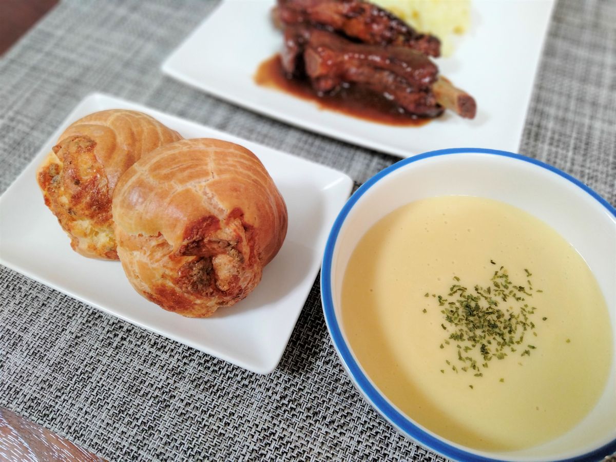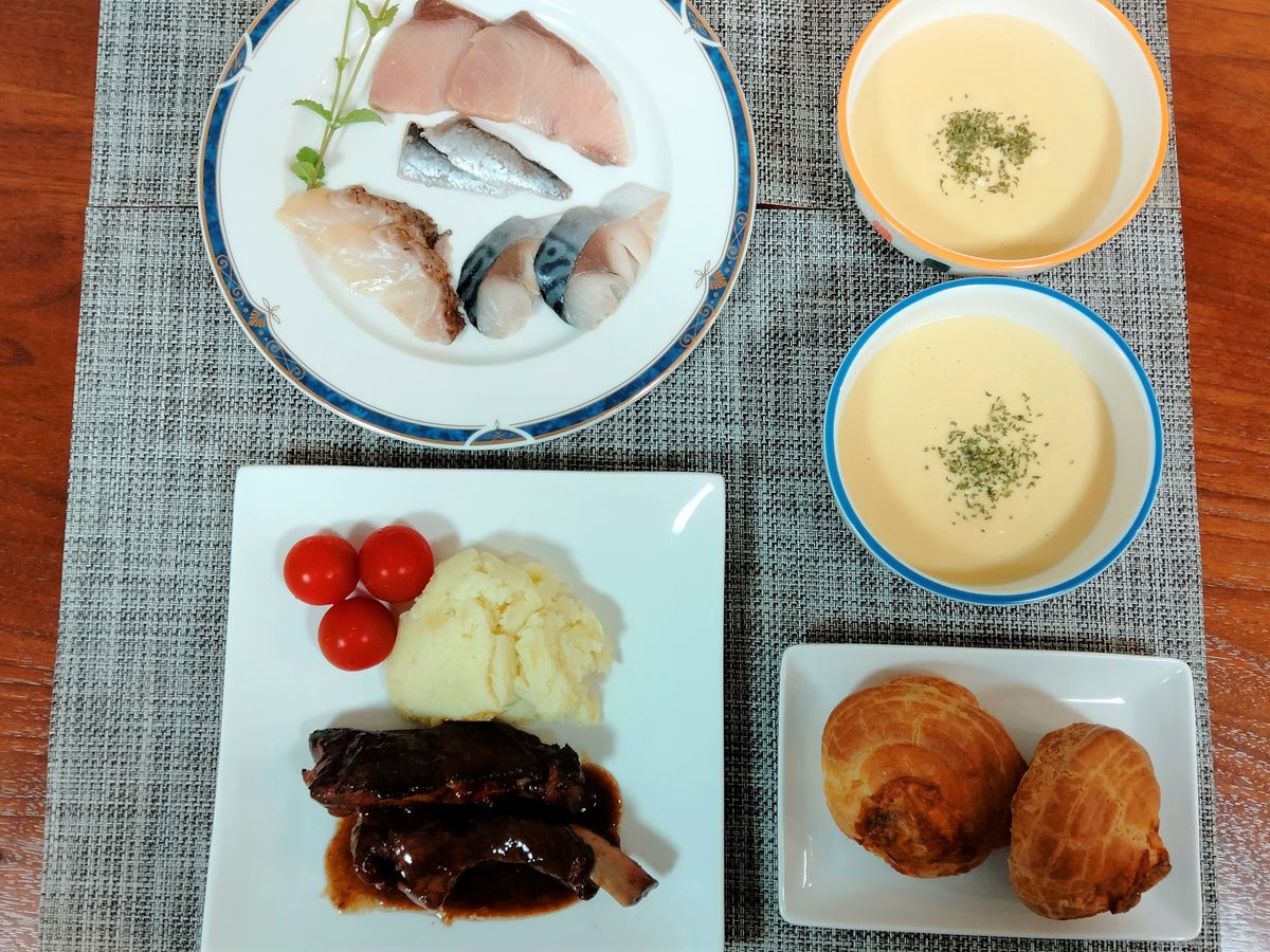 日曜日のランチ用に料理4品セットを注文しました。週末の昼間にワインを飲みながら食べるのに丁度良い量かなと思います。とうもろこしのポタージュスープは深みがあって優しい味。一気に飲み干してしまいました(笑)。4種のカルパッチョは冷凍とは思えないほどフレッシュな味で、ワインが進みます!どれも美味しいのですが、特に好きなのはブリの低温調理コールドスモークのカルパッチョと金華サバの自家製シャルドネビネガー〆です。豚バックリブは濃厚なソースがとにかく美味しく、これまたワインが進みます!シューパンは初めての食感と味でしたが、癖になります。キンキンに冷やしたスパークリングワインとロゼワインを1本づつ用意していましたが、二人で2本を美味しく空けました(笑)。ワインと一緒に是非!!