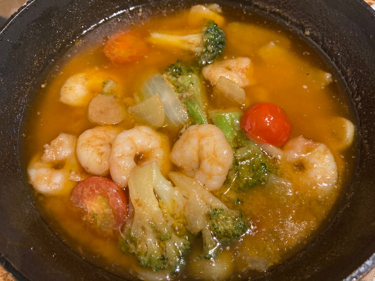 味違いのアヒージョ3種、エビとトマトのアヒージョにブロッコリーを足してみました。