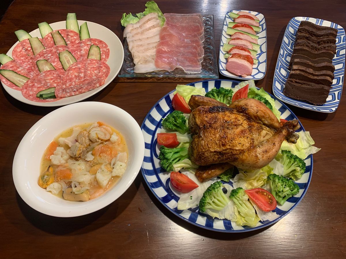 メインのロティサリーチキンは見た目も味も本格的で、味がしっかりしているので冷えても美味しいです。特製ハムはしっとりして、ワインによく合う上品な塩加減。魚介のマリネは魚介がゴロゴロしていて贅沢です。