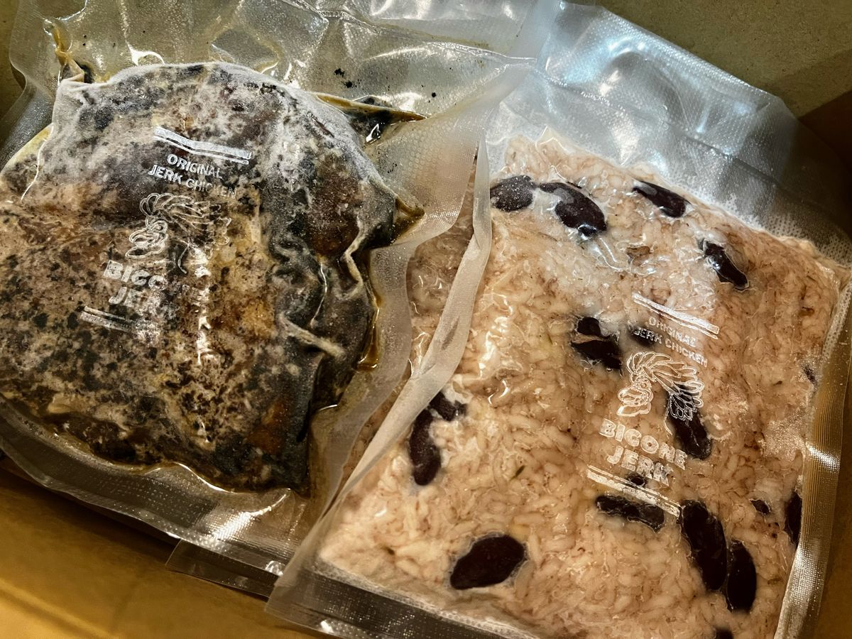 在宅勤務中のランチ用にジャークチキンとライスアンドピースが3つづつのセットを買いました。チキンを湯煎しながら、ライスを電子レンジでチンするだけの簡単調理で、異国情緒たっぷりのランチの出来上がりです。チキンはモモ肉が丸ごと1枚でボリューム満点、ライスも250gと十分な量です。ジューシーなチキンはもちろん美味しいのですが、個人的にはこのライスがお気に入り。絶対に自分で出せない味です。あと2個残っていましが、結構早く食べてしまいそうです。また買います!!