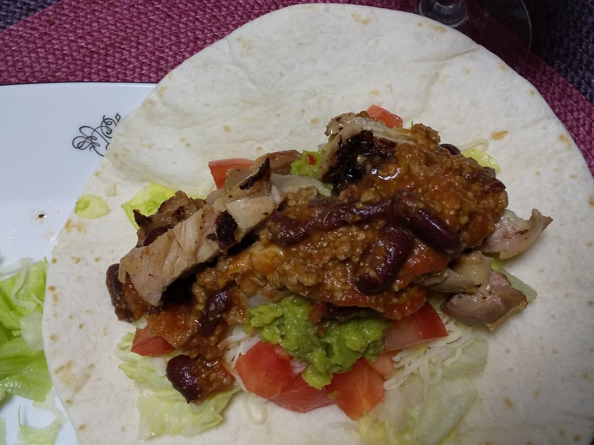 翌日はトルティーヤとワカモレを用意して、チリビーンズとチキンを温めてタコスにしました。