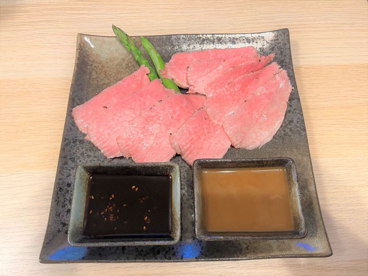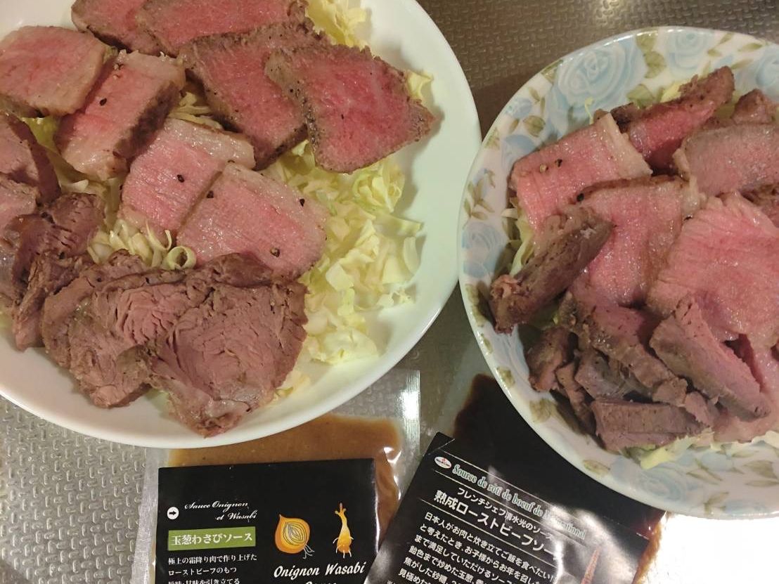 自宅でも外国産の赤身で度々ローストビーフを作っていますが、A5ランクの黒毛和牛は全然違うだろうということで購入してみました。見るからにキレイにサシが入った霜降りのお肉を切ると、食べる前から美味しいのが分かります。薄めに切って皿に並べると、神々しい美しさ!ソースを少し付けて食べると、普段食べているローストビーフとは違った異次元の食感!口に入れると、とろけていきます。1枚1枚と口に入れる度に笑みがこぼれ、幸せな気持ちになります。