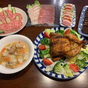 メインのロティサリーチキンは見た目も味も本格的で、味がしっかりしているので冷えても美味しいです。特製ハムはしっとりして、ワインによく合う上品な塩加減。魚介のマリネは魚介がゴロゴロしていて贅沢です。