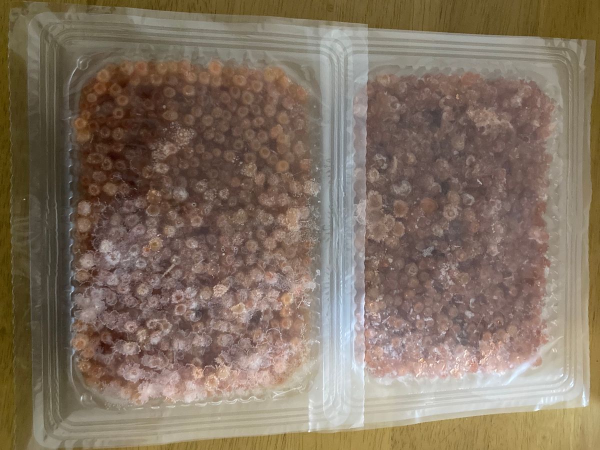 同封されていた解凍方法を確認すると冷蔵庫での自然解凍で24時間が目安との事でしたので、食べたい気持ちをちょっと抑えてお休みの日に「いくら丼」をするぞと心に決めて、休みの前の日に冷凍庫から冷蔵庫に移動させ、自然解凍開始。そして休みの日の夕食。ここでいくら丼を食べようと冷蔵庫から取り出して開封。