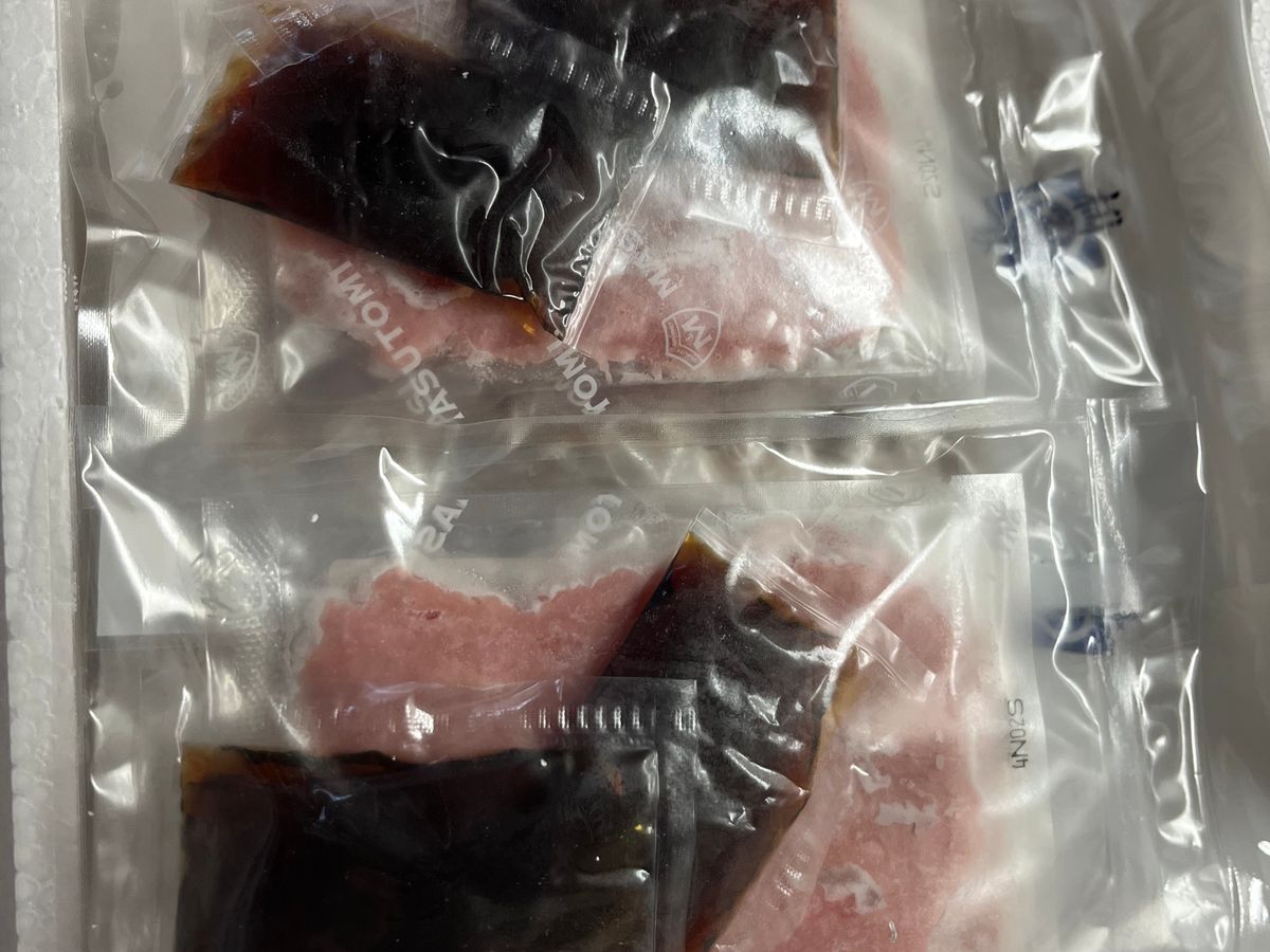 配送指定日に冷凍の状態で届きました。梱包状態もよく、4種類の商品が入っていました。マリネなので味は少し濃いめでしたが、北陸の復興支援にもなりました。