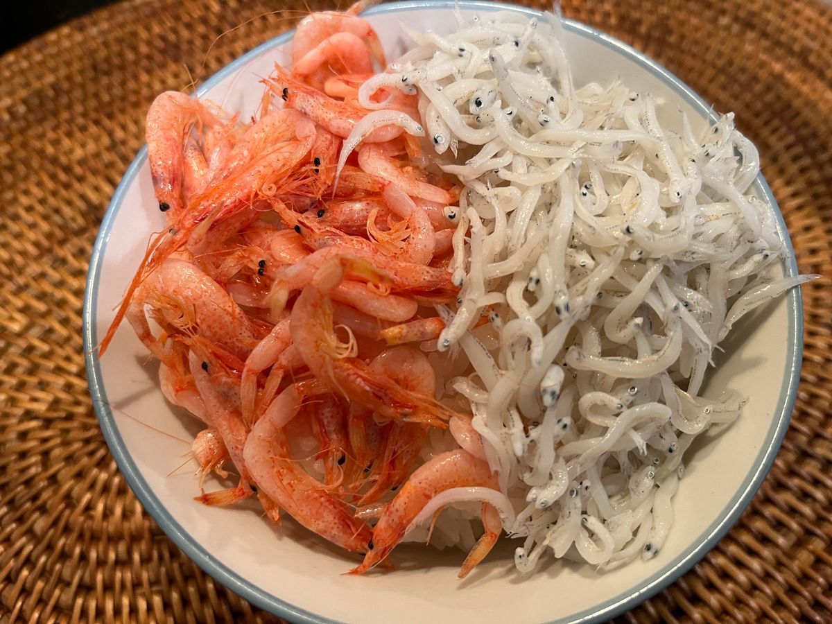 以前に静岡で食べた釜揚げ桜海老の味が忘れられず、注文してみました。さすがに冷凍したものは味が落ちると思ったのですが、冷蔵庫でゆっくり解凍したからか、水分も殆ど出ず、プリプリに。炊き立ての白ご飯の上に桜海老と釜揚げしらすを半分づつ&たっぷりのせて、贅沢な釜揚げ2色丼の出来上がりです。醤油を少したらして食べたら、それはそれは美味しい!あっという間に食べ終わって、2杯目に突入でした(笑)。