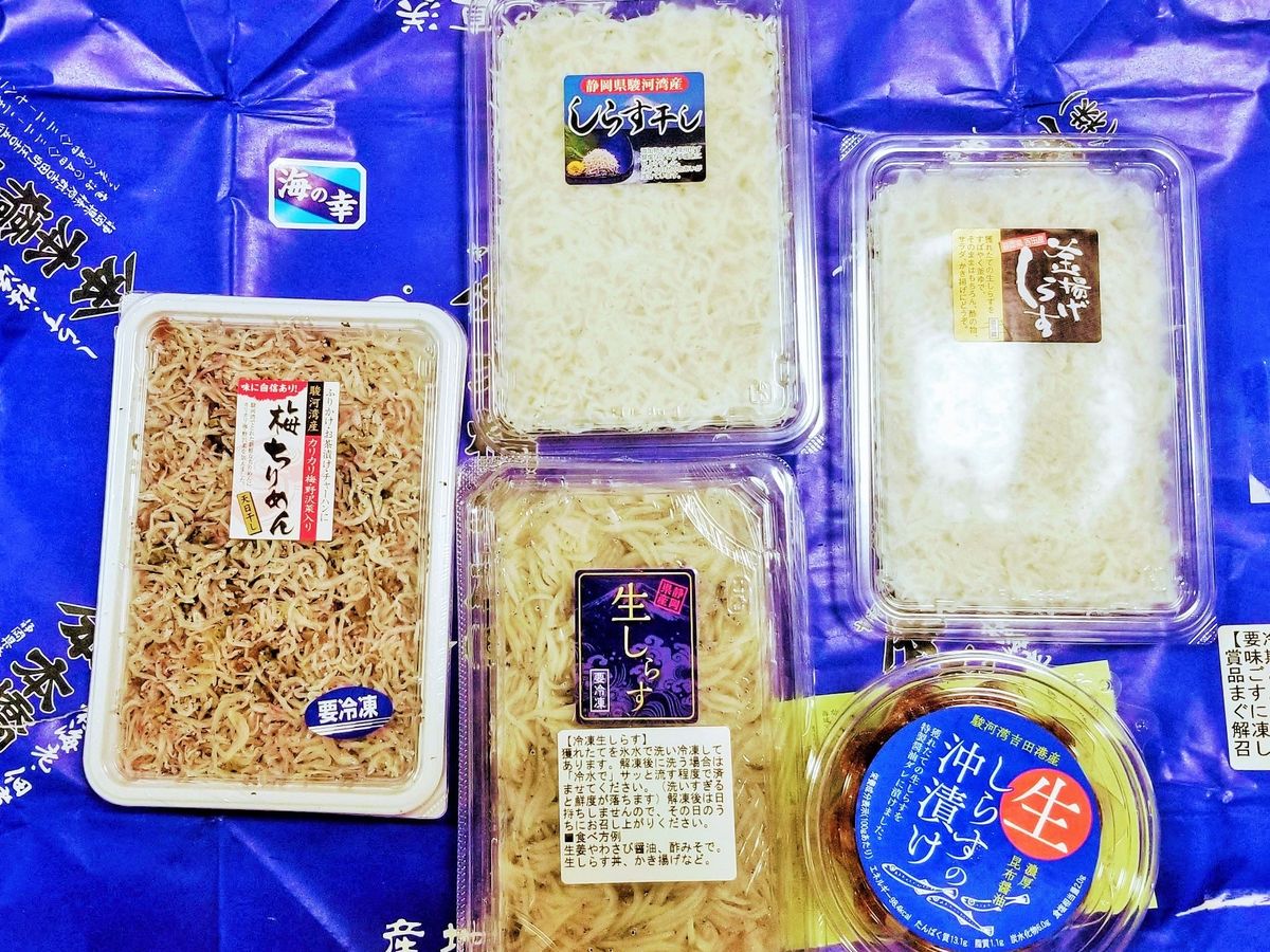 生しらす、生しらすの沖漬け、釜揚げしらす、干ししらす、梅ちりめんと色んな風味が楽しめるセットでした。【冷凍で届きます】
