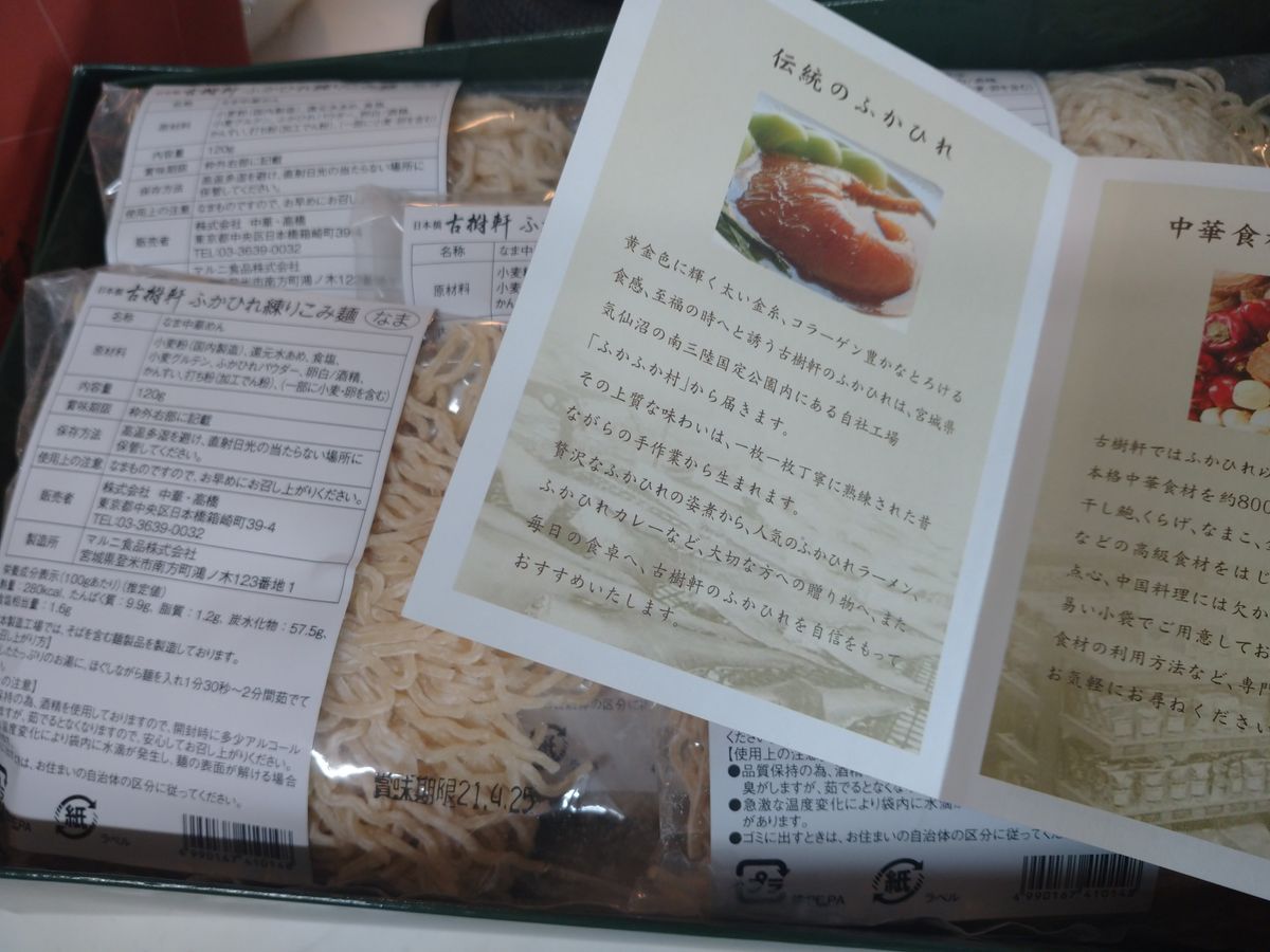 今回「ふかひれラーメン」を注文しました。そのまま贈り物にもよさそうな丁寧な梱包で届き、びっくりしました。