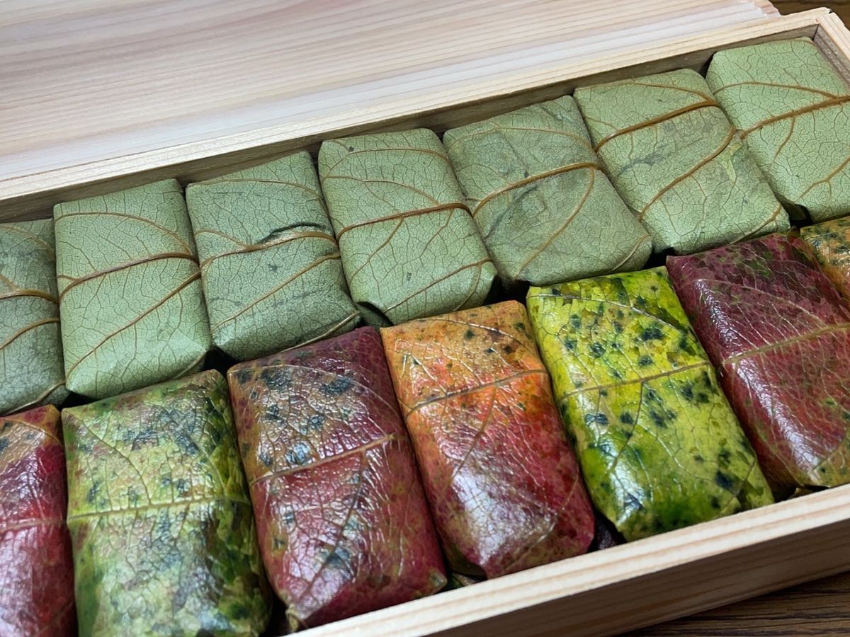 ちょうど季節が合い、紅葉した柿の葉で包まれていて綺麗だととても喜ばれました。