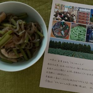 金時草は葉っぱだけをちぎって30秒だけゆがき、ポン酢で食べました。シャキシャキした食感とクセのない味で、かなり美味しいです。「かたは」は3センチくらいに切って3分茹で、レシピにあった塩昆布ではなく、ヒガシマルのちゃんぽんスープの素であえました。セロリのような食感ですが苦味やクセはなく、こちらも美味。この2つの野菜に出会っただけでも、加賀野菜をお取り寄せした価値がありました!