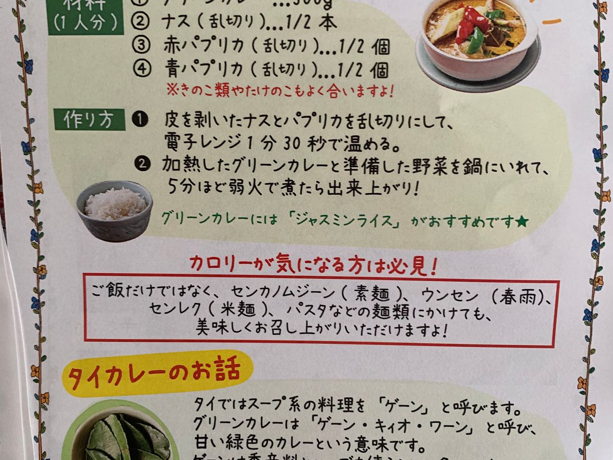 グリーンカレーについてはお店の味をそのまま再現するため具はチキンのみとなっておりますが、野菜をトッピングするとさらにお楽しみいただけるのでそのように調理していただきとてもありがたく嬉しい限りです。