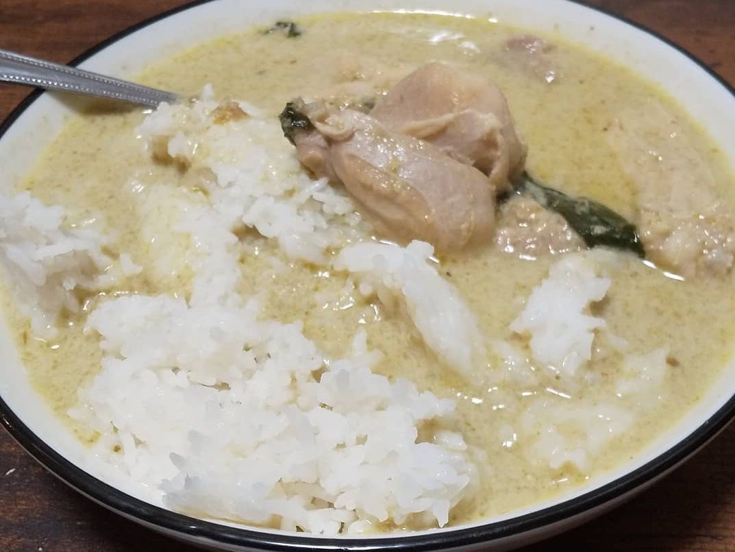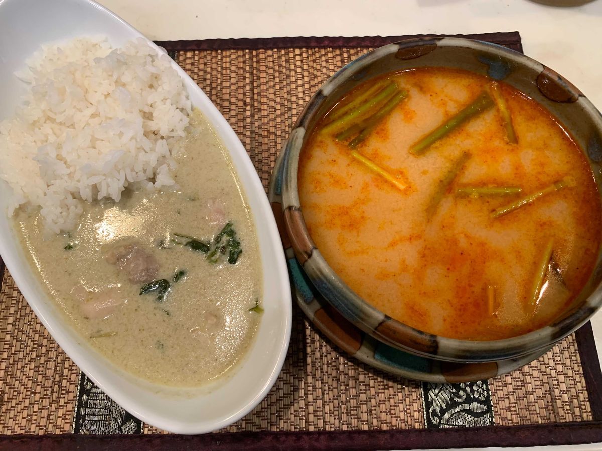 楽しみに最後に残しておいたトムヤムクンとグリーンカレーを食べました。トムヤムクンはお店によって味が異なりますが、このトムヤムクンは自分好みのクリーミーで少し甘めのもの。写真では具があまり見えませんが、エビやフクロタケなどの具がゴロゴロ入っています。量としては2人で分けてもいいくらいの量がありますが、美味し過ぎて一人で飲み干してしまいました。