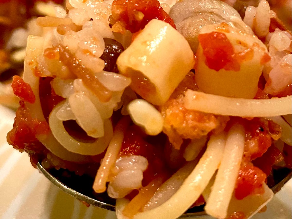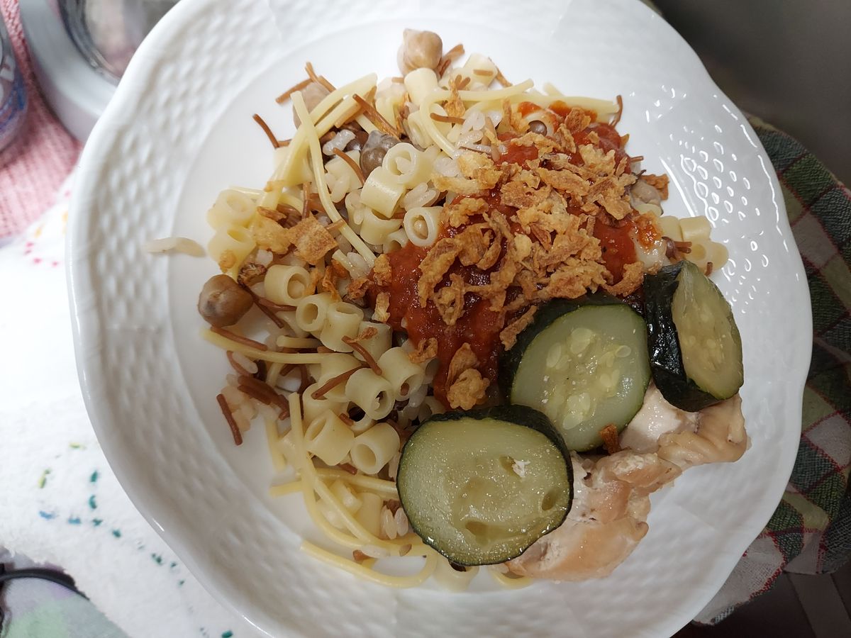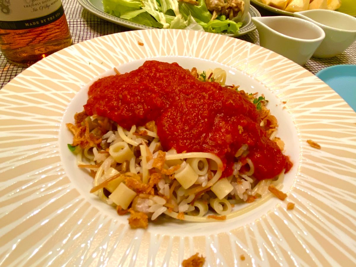 世界のGOHAN、4回目はエジプトパスタにご飯に豆類、どうしてこのような組み合わせの料理が生まれたのか、不思議に思いながら、作り方にそって調理♪とても相性が良い組み合わせに納得…トマトソースとフライドオニオンが仕上げの味付けに最高に合っていました!酸味と辛味のソースで味のバリエーションをつけながら楽しめました。量的には2人なので、半分の量で作って充分でした。次回は温玉とチーズも加えて楽しみます