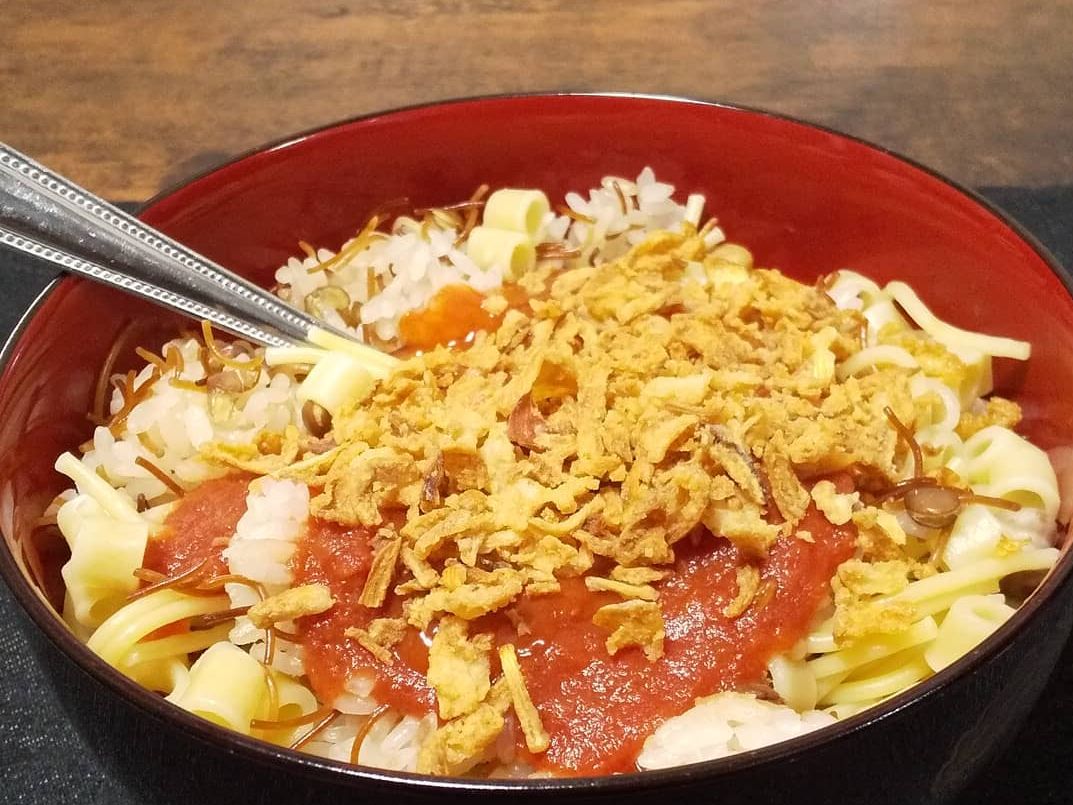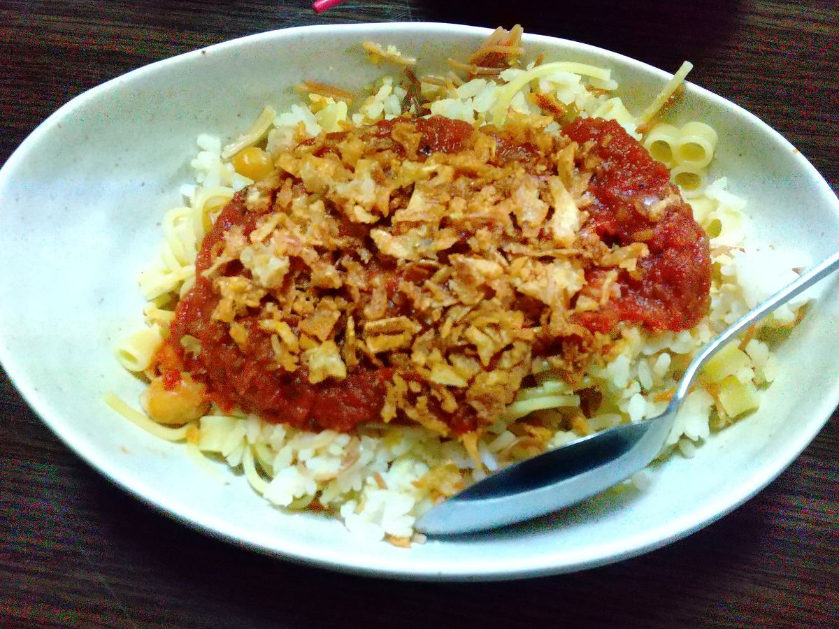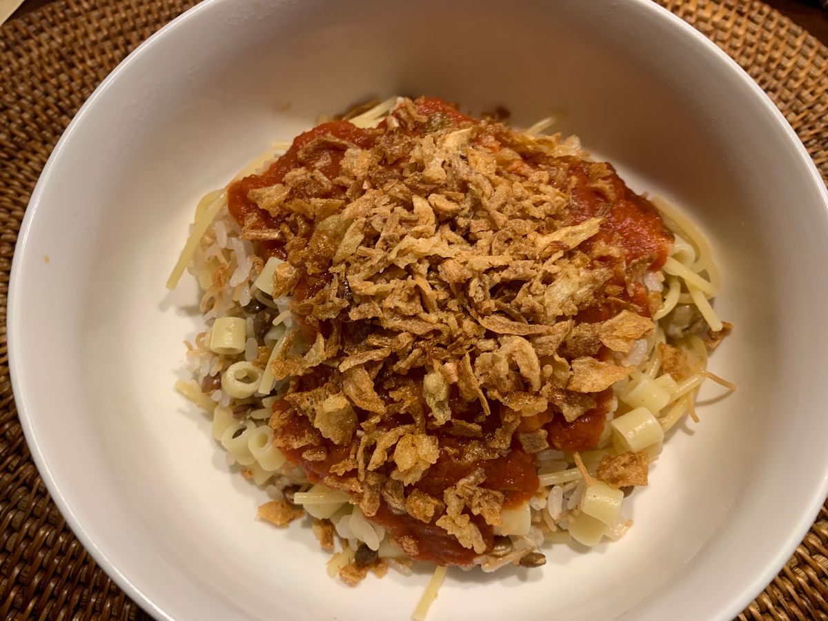 エジプト以外で食べたことがなく、もちろん日本で食べるのも初めて。豆を水に浸したり、炊飯器にかけたり、パスタを茹でたりと工程はそれなりにありますが、エジプトで食べた味を自宅で再現できました!最初はトマトソースだけで食べ、酸っぱいダッアと辛いシャッタの量を変えながら味変。これがまた美味しいんです。3〜4人前とありますが、結構な量になるので、お腹いっぱいで満足です!