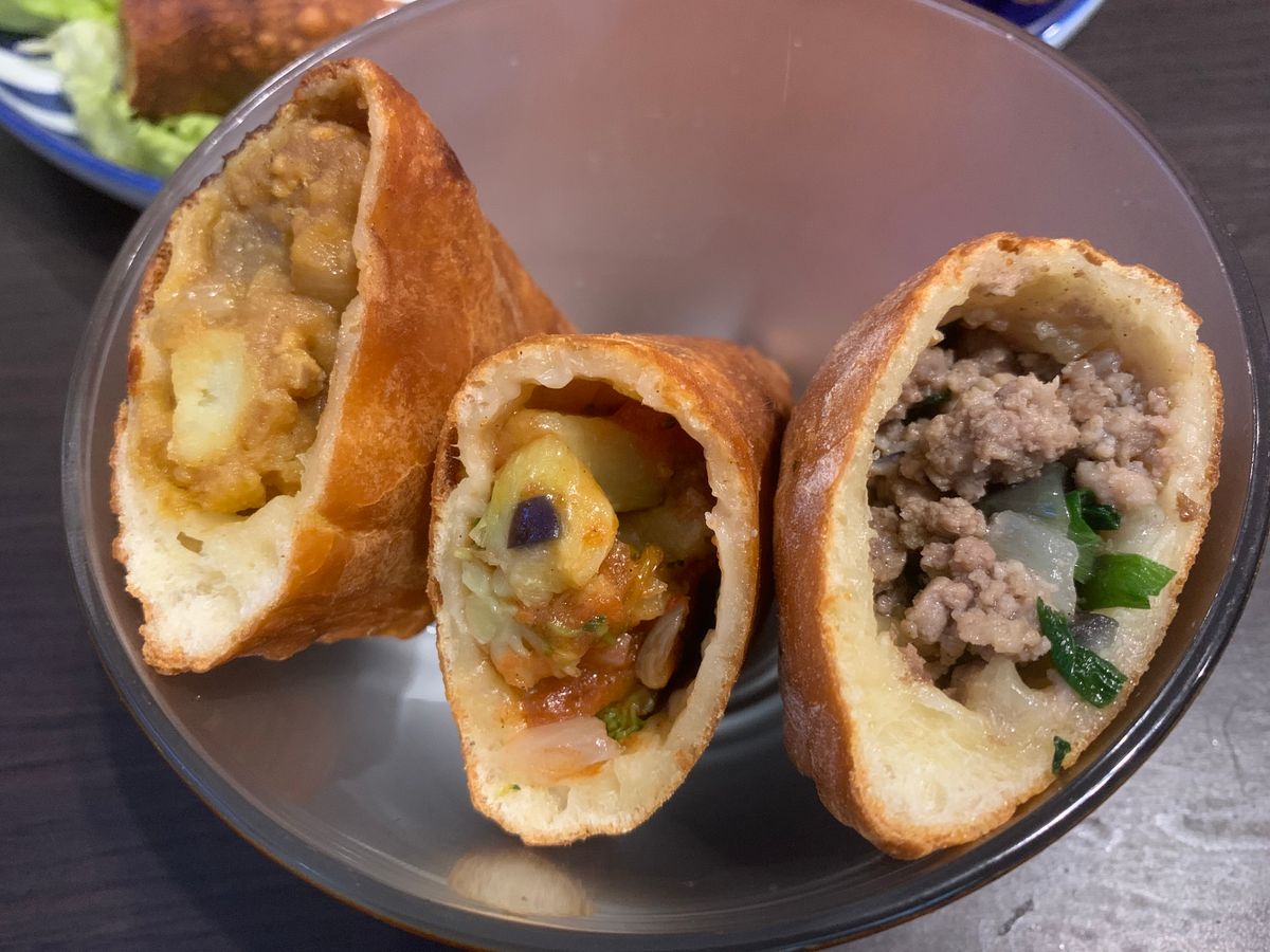 餃子のような肉まんのようなホーショールは、冷凍の状態のままで170度の油で5分揚げるだけ。何だか懐かしくもあり、新しい味で美味しい!個人的にはトマト味(?)の野菜のホーショールが一番好きですが、肉汁たっぷりのお肉のホーショールもチーズが入ったカレーのホーショールも美味しい。子どもたちがペロリと食べてしまいました。