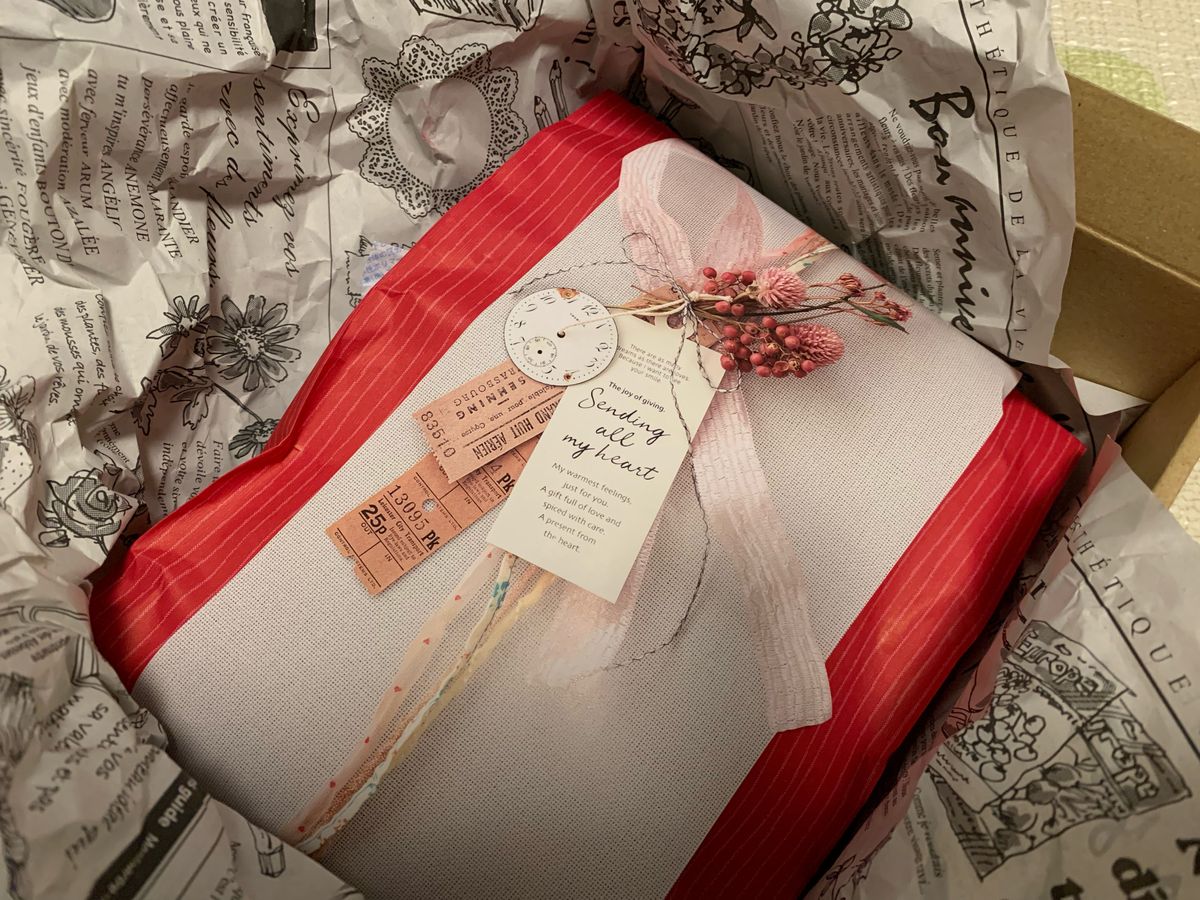 まず荷物が届いた際に「贈り物在中」のシールが貼ってあり、大切にされている気持ちになりました。荷物を開けてみると、ギフト用の袋が英字新聞で包んであり、可愛らしいパッケージです。これなら誰かに送りたくなります。