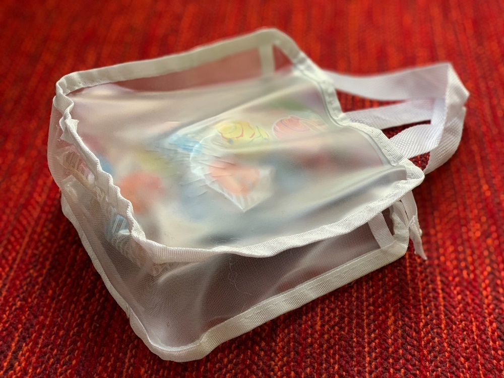 すりガラス風の表面で中身は見えにくいのに、側面と底が細かいメッシュになっているので多少濡れたりしていても蒸れることなく清潔に持ち運びができます。
