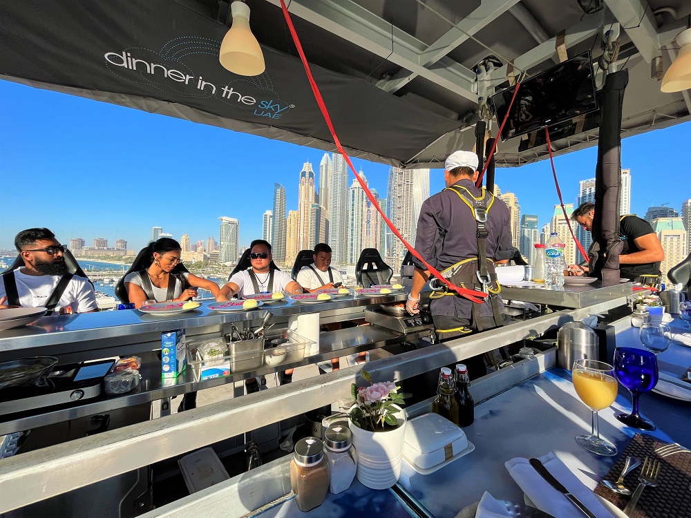 2017年に営業を開始した「Dinner in the Sky Dubai®」の人気はコロナ過でも衰えず、クレーンが2台体制=キャパシティが2倍に増えました!1日でランチ2回、アフタヌーンティー1回、ディナー3回の合計6回をフル回転で営業中です。
