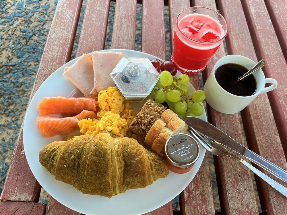 気球から降りたら、デザートキャンプに移動して、まずは朝ごはん。砂漠の中で食べているとは思えない濃厚でねっとりした旨さのスモークサーモン、オーガニックでとにかく美味しいクロワッサン、フレッシュなスイカジュースなど、質の高いブレックファーストビュッフェを楽しみます。お腹が落ち着いたら、乗馬、乗ラクダなどの無料のエクスカーションに挑戦してみてください!