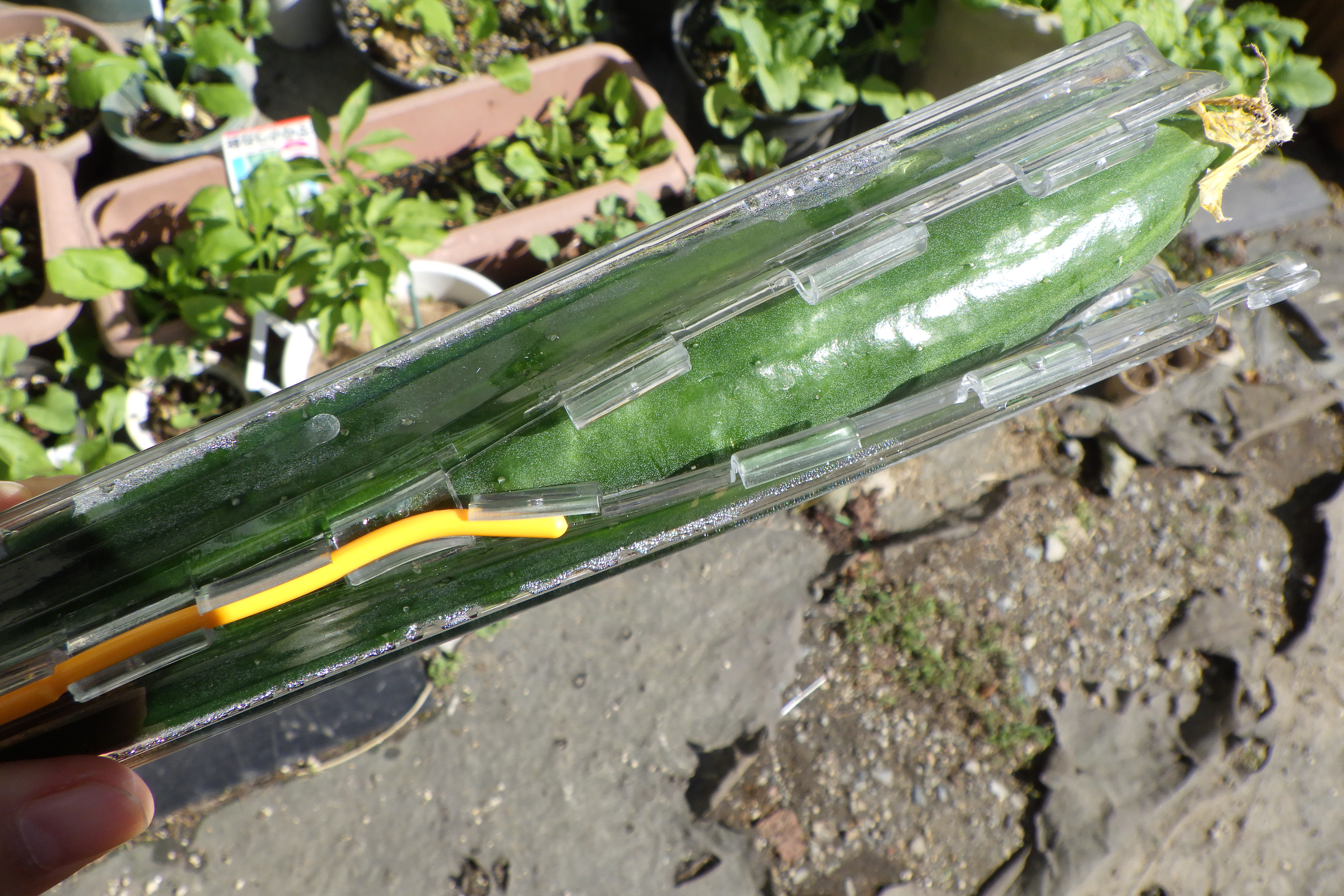 きゅうりが育ちきる前に取り付けると、かわいい形に育つというグッズです。