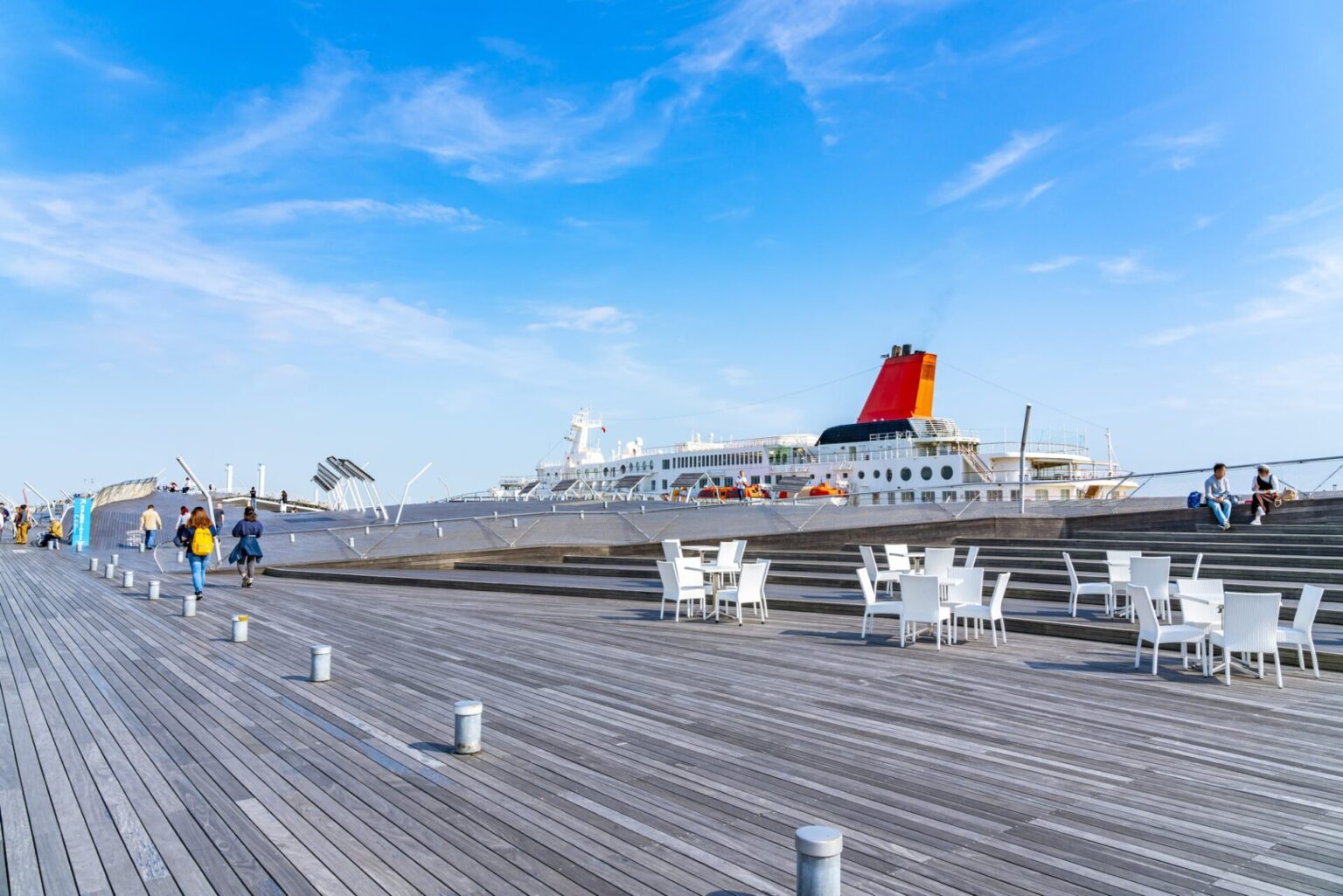 横浜港大さん橋 国際客船ターミナルでは、巨大なクルーズ船を間近で見学できます。海と空の広がりを感じながら、横浜の港町らしい風景を楽しんでみませんか。