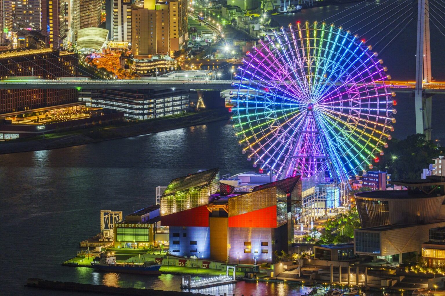 大阪の夜を特別なものにするなら、大阪南港にある観覧車からのロマンチックな夜景はいかがでしょうか。大阪湾に面したこの観覧車は、高さ112.5メートルからの眺望で、大阪の街並みを一望できます。特に夜は、煌めく街の灯りが水面に映り込み、幻想的な雰囲気を演出してくれます。