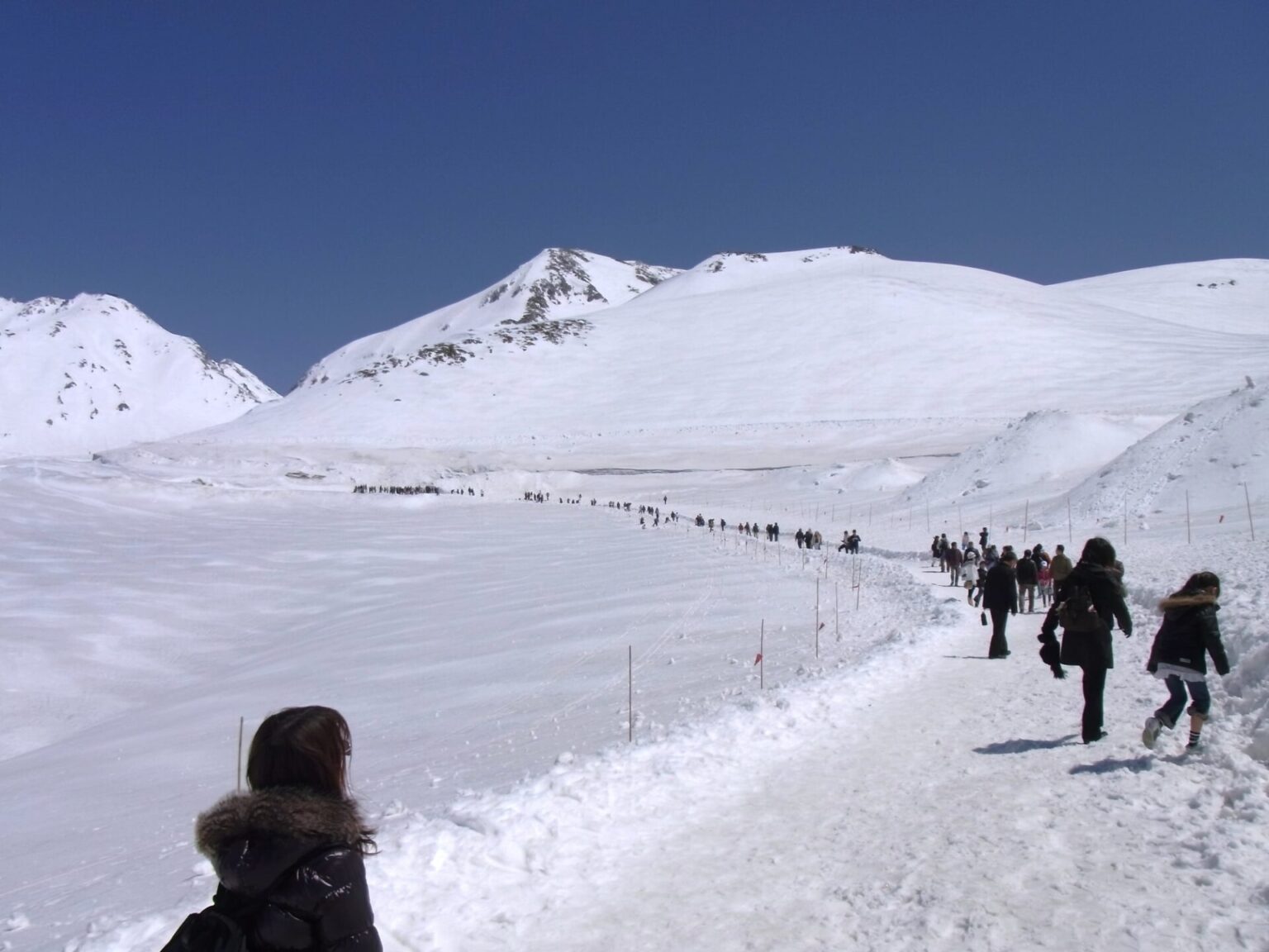 「雪の大谷ウォーク」では、この雪の壁の間を歩くことができ、まるで別世界に迷い込んだかのような体験をすることができます。また、「雪の回廊」では、室堂ターミナルと自然保護センターを結ぶ道を歩き、雪の壁を間近で感じることができます。