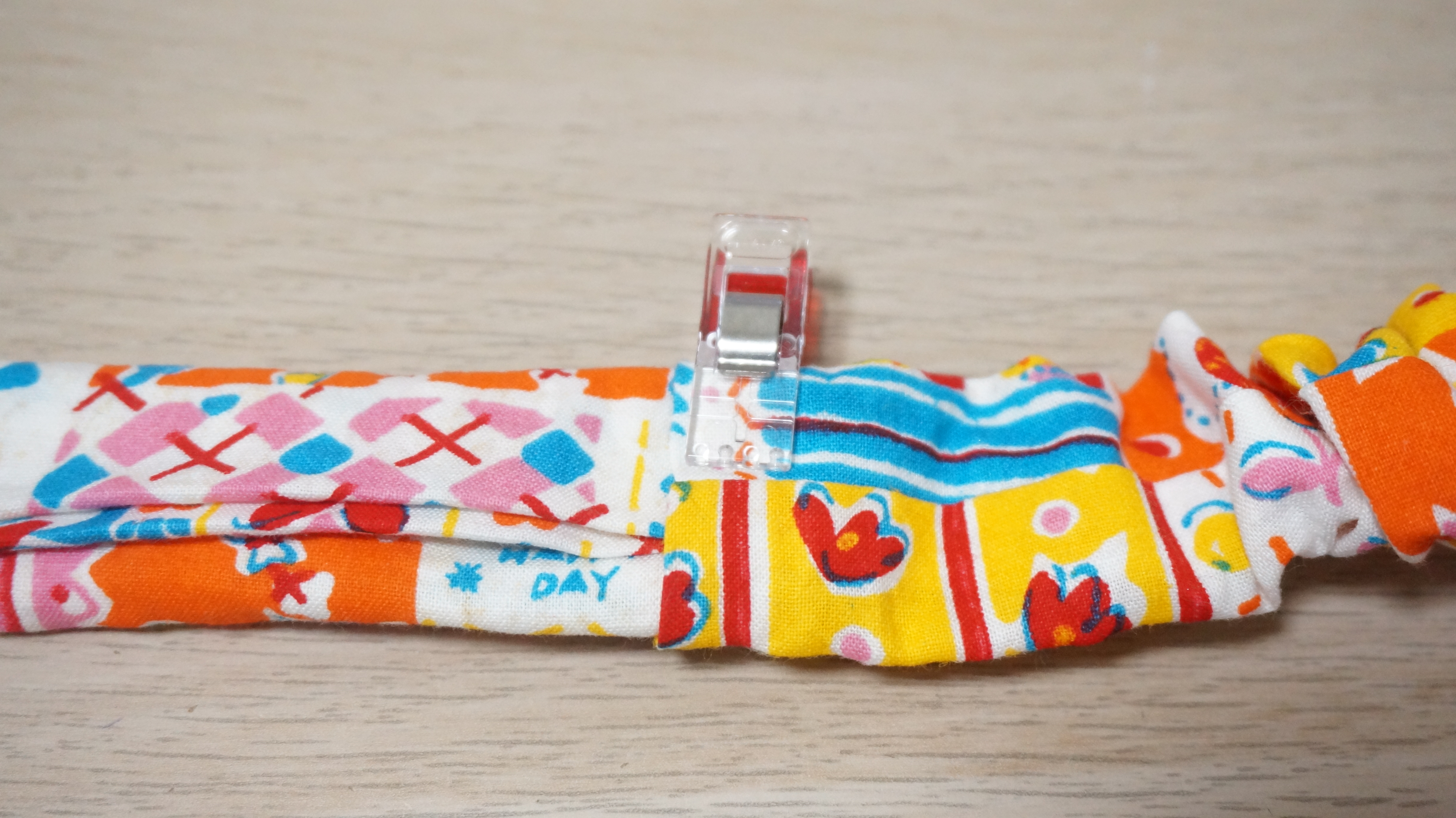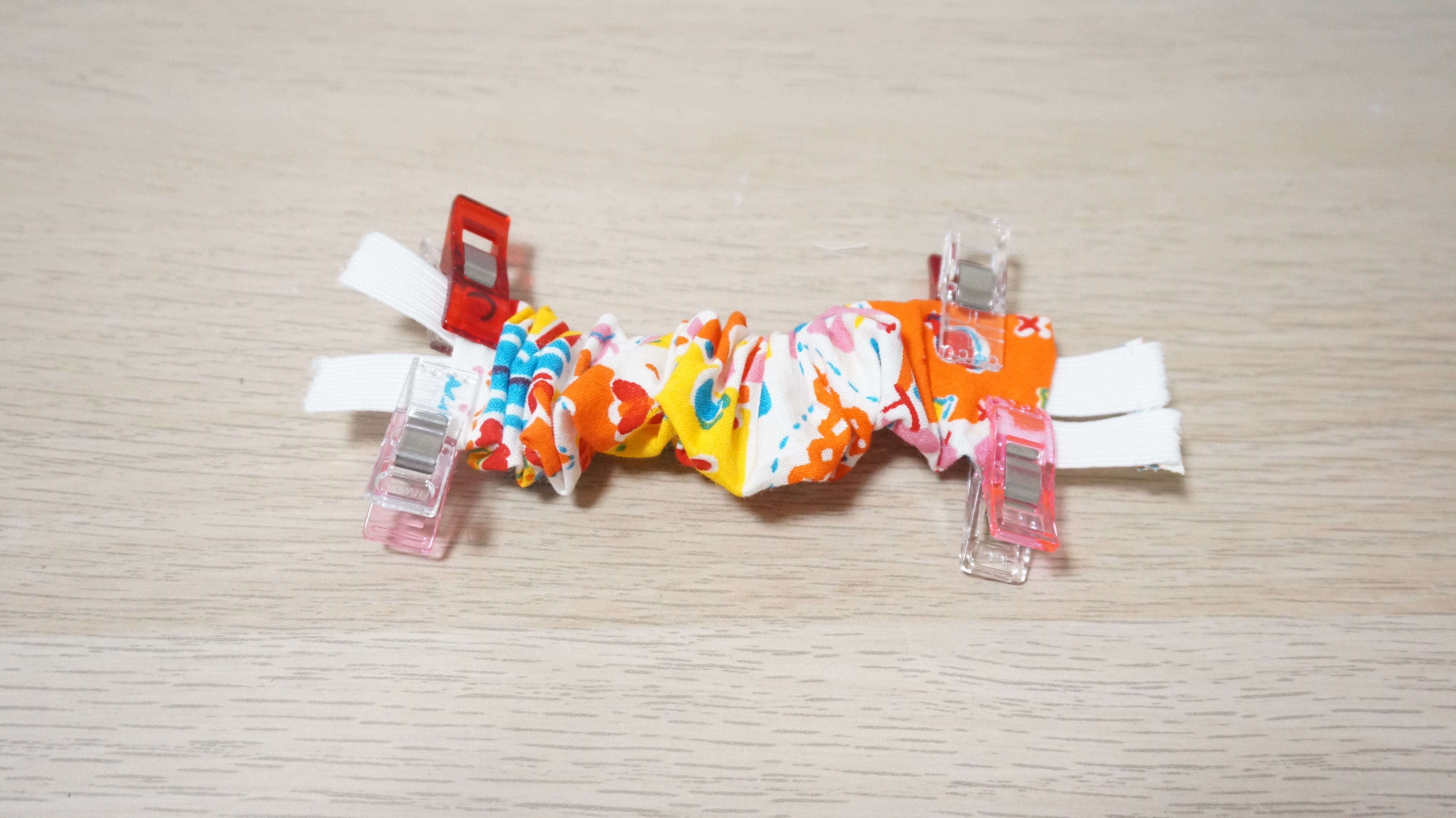 両端をゴム2cmずつ出してクリップまたはまち針で生地を止めておきます。
