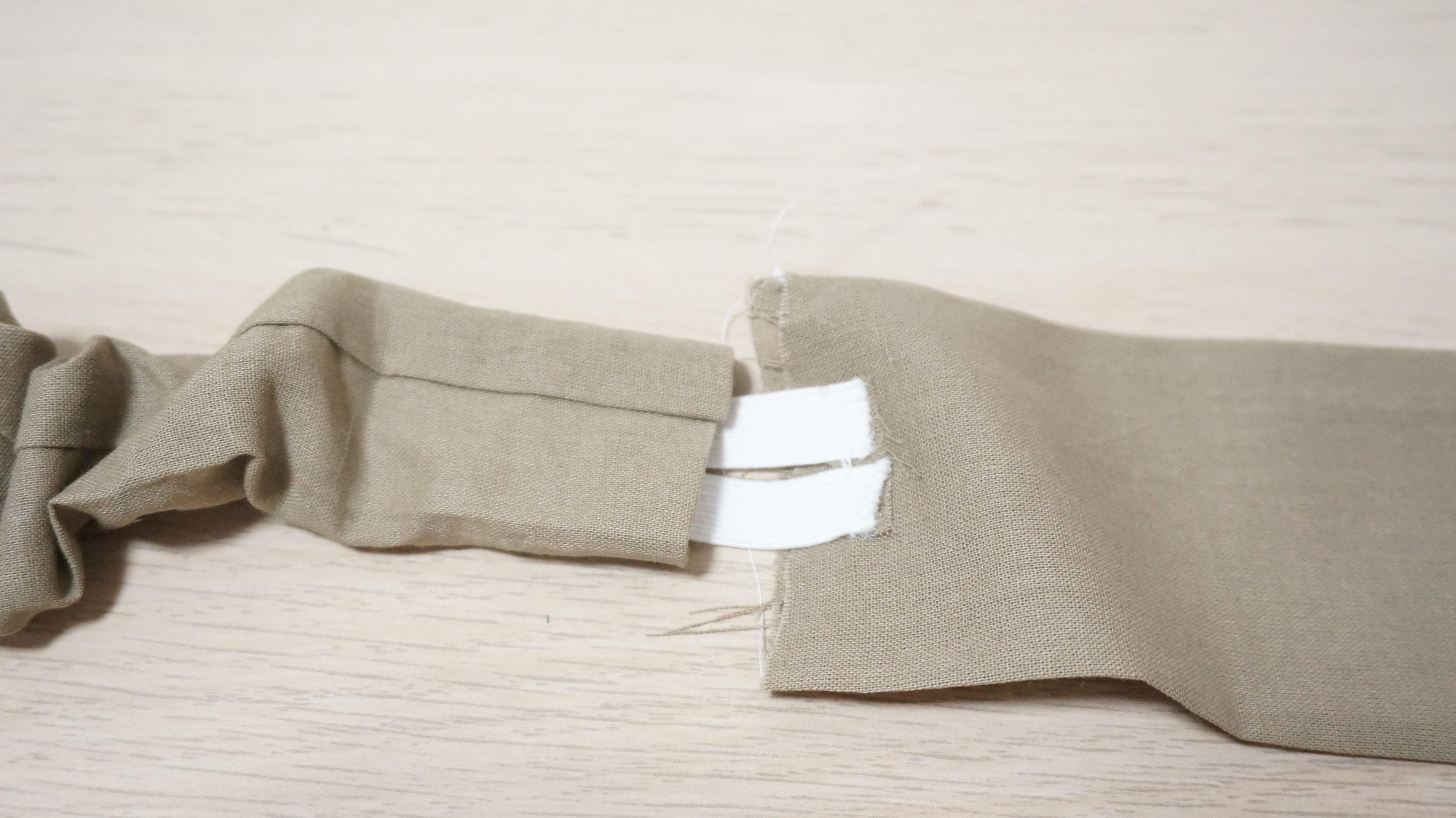 バンド部分に1cmゴムを重ねて縫っていきましょう。左右ともに縫っていきます。返し縫いを行い外れないようにしっかりと縫ってください。