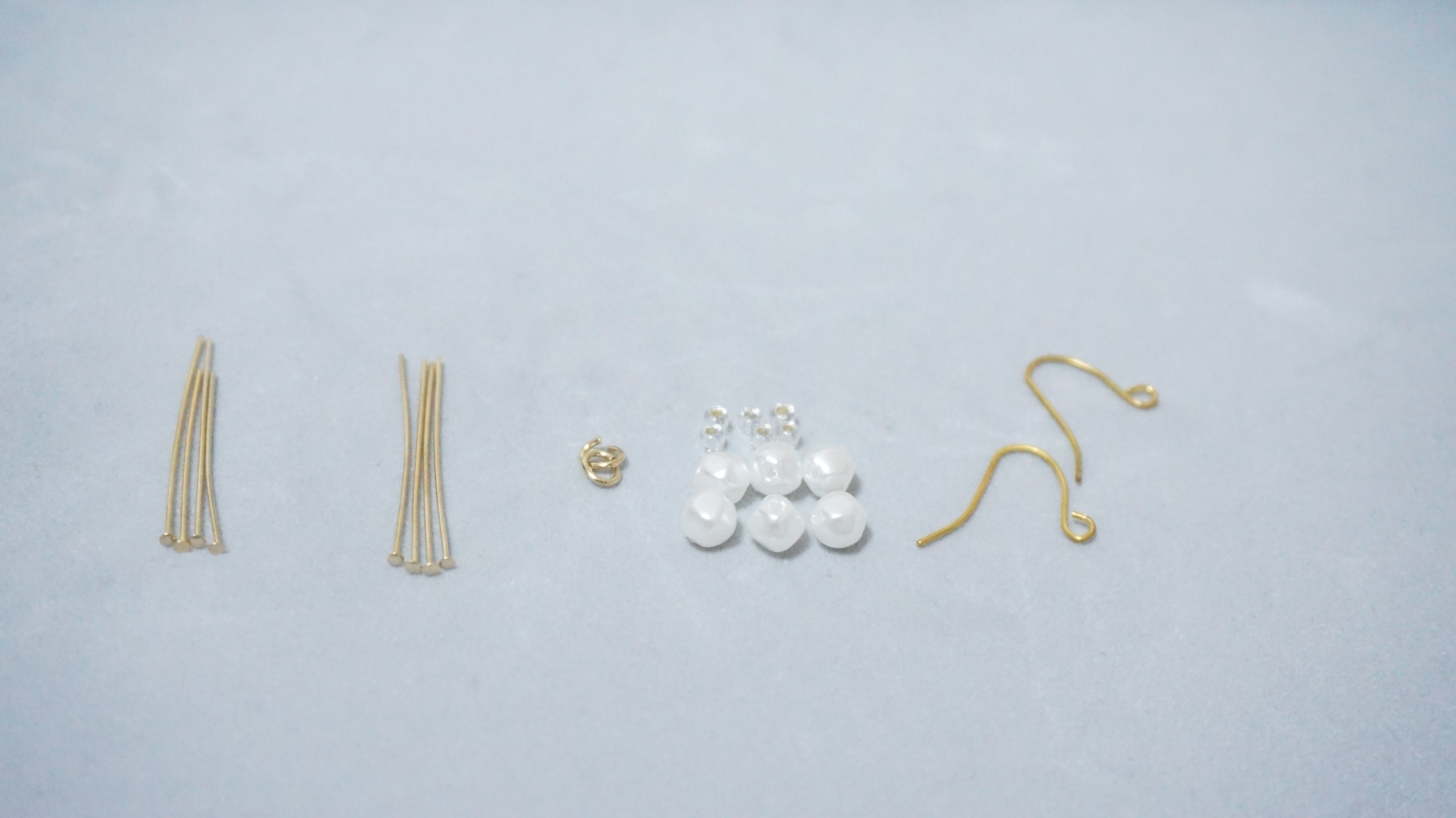 イヤリングの場合は、マルカンが必要になりますがピアスの場合は必要ありませんでした。初めてアクセサリーを作る場合は、Tピンがうまく曲げられない場合があるので多めに準備しておきましょう。