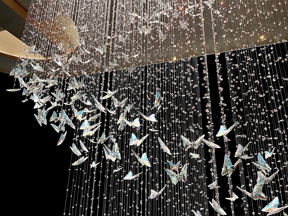 エントランスから2階へ上る階段ではラグジュアリーな気分を高めてくれるシャンデリアがゲストをお出迎え。 オーストリアから取り寄せた合計460を超える大小の蝶と、数万個のスワロフスキークリスタルによって彩られ、天井からの光を受けて反射するクリスタルライトはインスタレーションアートのように絶えず変化する世界を表現しています。