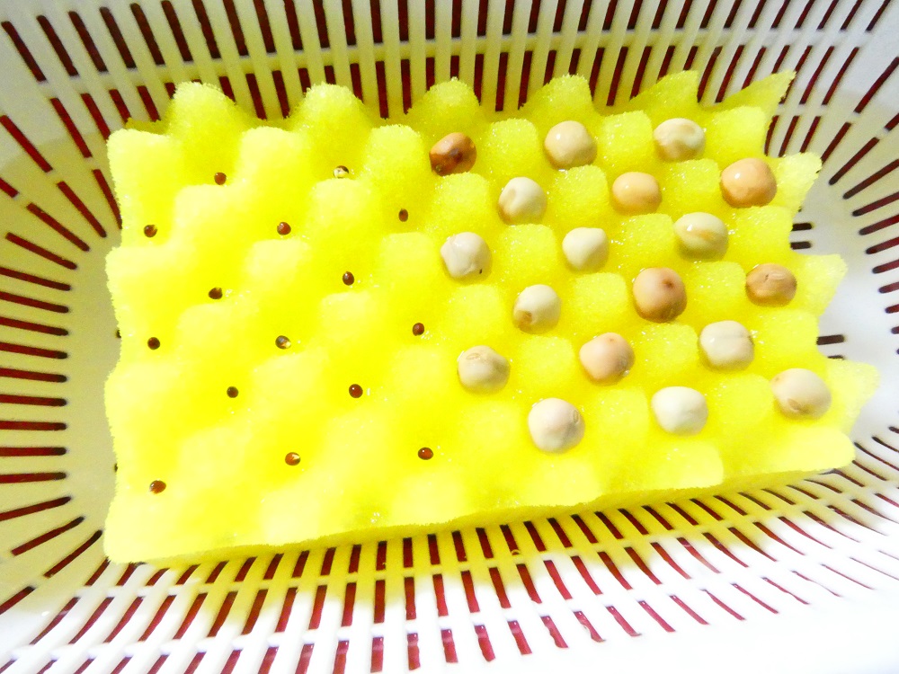 培地にスポンジを用いましたが、サカタのタネ・オンラインショップ「種と水と容器だけでOK!簡単!スプラウト栽培」では、スポンジ培地を使わず、ざるに直接種まきしています。これもアリなのかと思いました。
