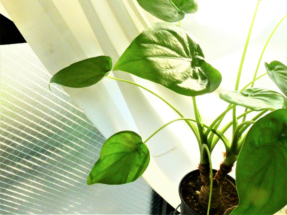 クワズイモは、食べられない芋なので「クワズイモ」という和名がついていますが、サトイモ科アローカシア属です。アローカシア属は寒さに弱いものが多いのですが、大きくなるクワズイモも、あまり大きくならないシマクワズイモも、沖縄や小笠原諸島に自生していて、室内栽培であれば冬でも枯れたりしません。
