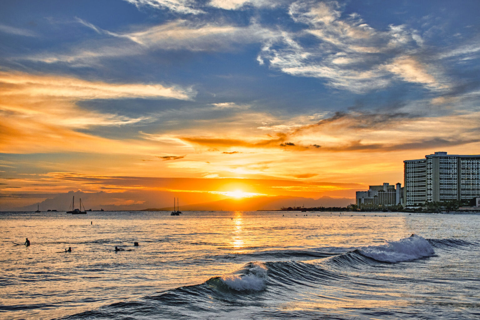 ハワイの旅の締めくくりに、サンセットビーチでの夕日鑑賞は欠かせません。このビーチは、その名の通り、壮大な夕日の景色で知られており、多くの観光客や地元の人々が訪れます。夕日が海に沈む瞬間は、まるで時間が止まったかのような静寂と美しさに包まれます。