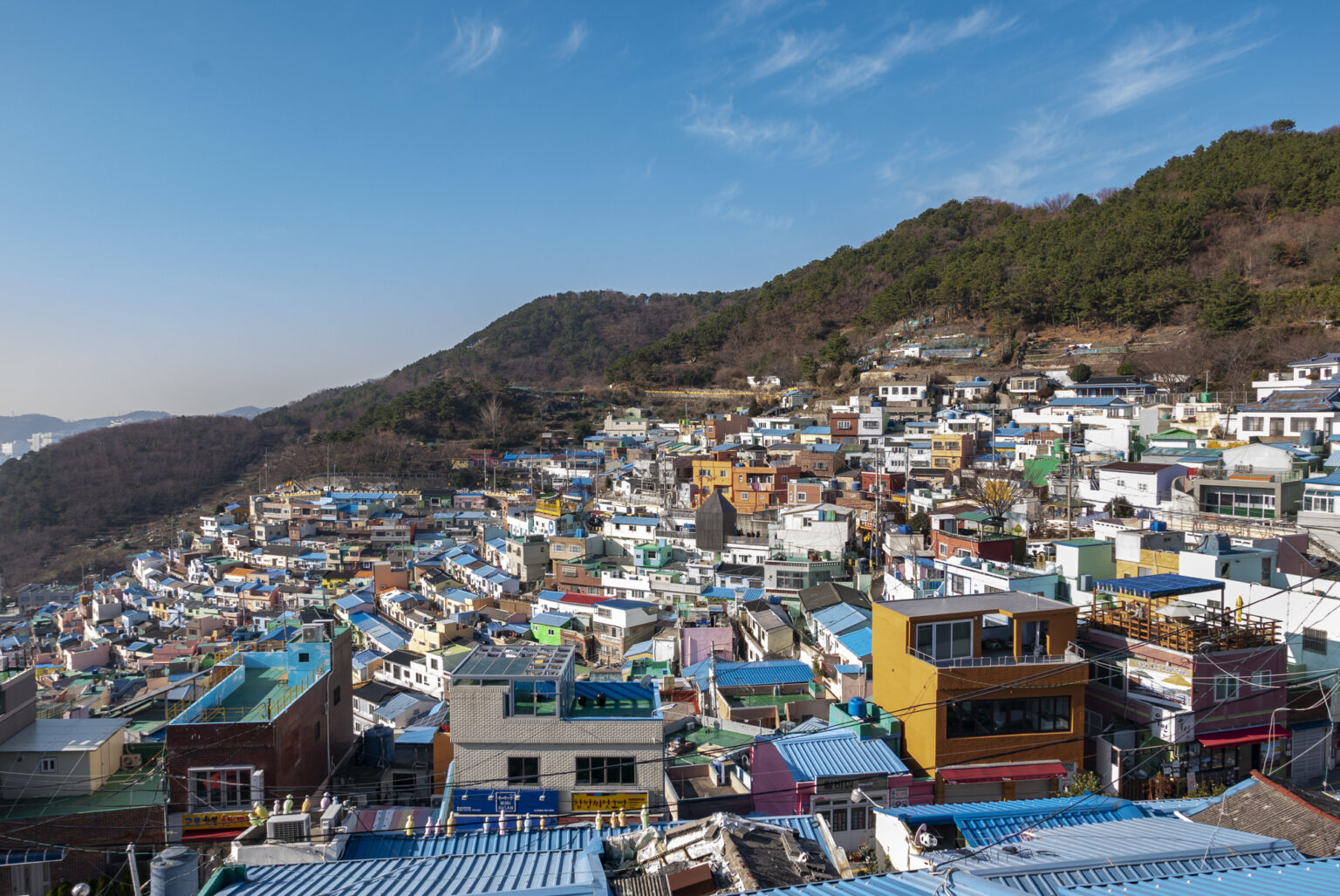 「釜山のマチュピチュ」と称されるほどの美しい風景を持つ甘川文化村は、釜山の象徴的な観光地として知られています。その起源は、韓国戦争時に避難民たちが住みかを求めて斜面を開墾したことに始まります。2009年には「村美術プロジェクト」対象地域に選ばれ、学生や芸術家、住民たちが協力して村の景観を整備し、新たな観光スポットとして生まれ変わりました。