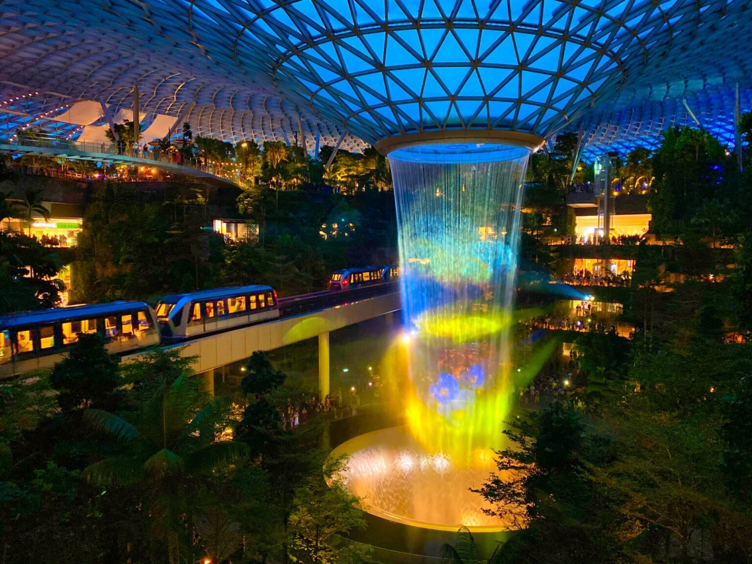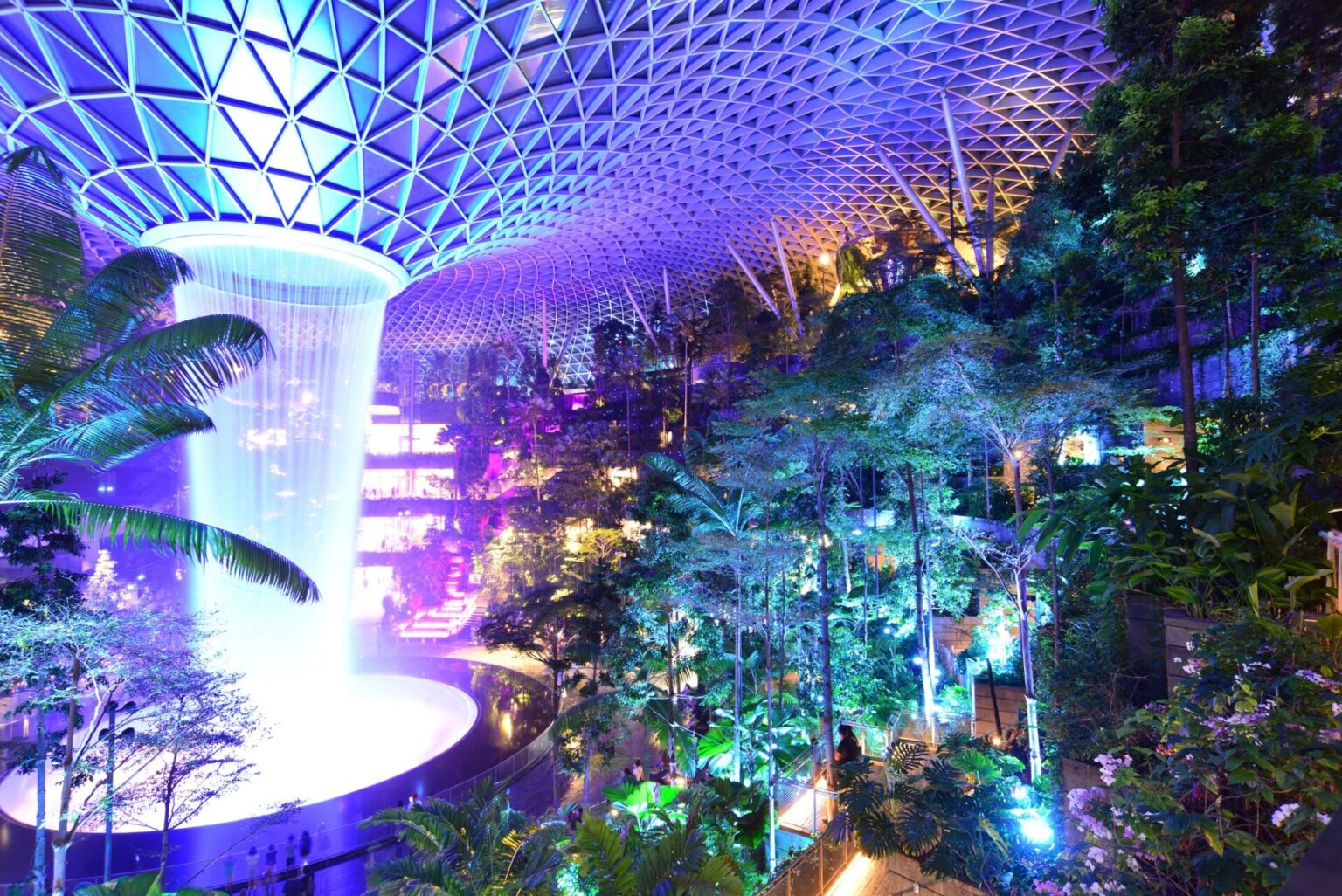 ジュエルの中心には、世界最大級の室内滝「レイン・ボルテックス」があります。この滝は、特に夜になるとライトアップされ、幻想的な雰囲気を醸し出します。また、周囲には「フォレストバレー」と呼ばれる緑豊かな庭園が広がっており、散策するだけでも一日がかりです。
