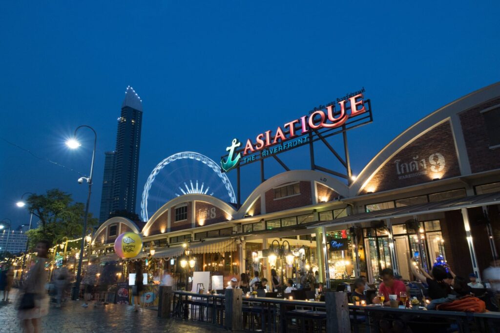 ショッピングの合間には、アジアティーク内にある観覧車に乗って、バンコクの夜景を一望するのもおすすめです。この観覧車からは、チャオプラヤ川とバンコクの街並みが美しく見渡せます。また、週末には様々なパフォーマンスやイベントが開催されることもあり、訪れるたびに新しい発見があります。