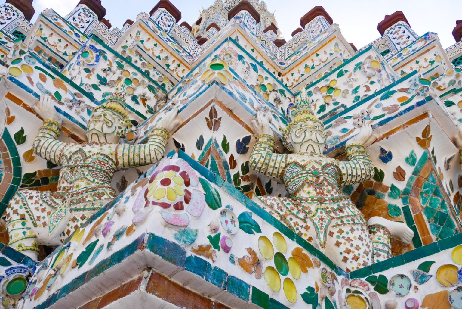 大仏塔は3つの階層から成り立ち、各階には鬼、猿、天使の彫刻が施されており、その装飾の細部には目を見張るものがあります。また、仏塔の上部にはヒンドゥー教の神々が祀られているとされ、仏塔の下部には中国人風の銅像や彫刻が飾られています。これらの特徴は、ワットアルンがタイだけでなく、さまざまな文化の影響を受けていることを示しています。
