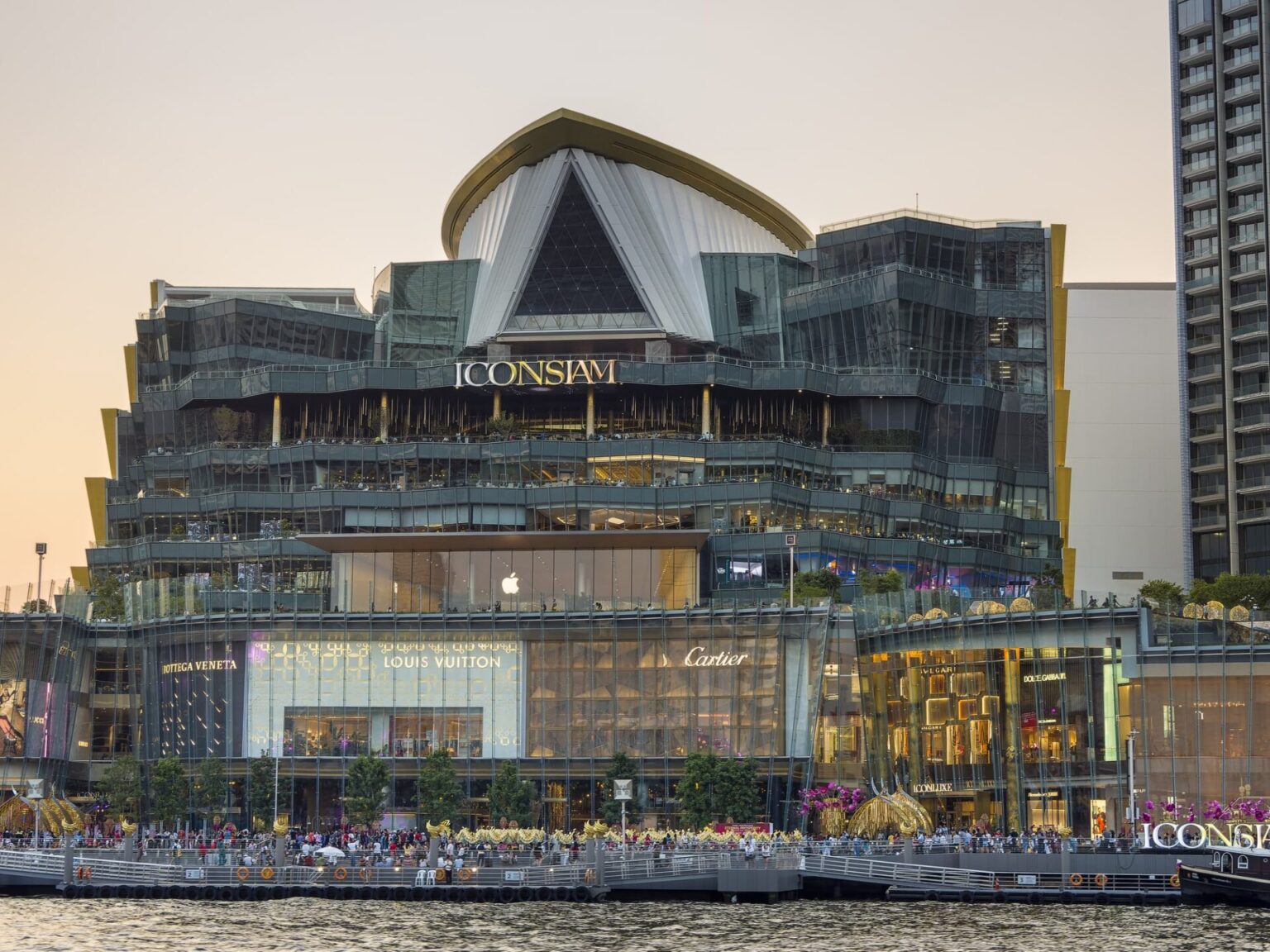バンコクのチャオプラヤ川沿いに位置するアイコン・サイアムは、水上マーケットを思わせるユニークなデザインが特徴のショッピングモールです。タイの伝統的な市場の雰囲気を現代的に再現したこの施設では、ショッピングだけでなく、文化的な体験も楽しむことができます。