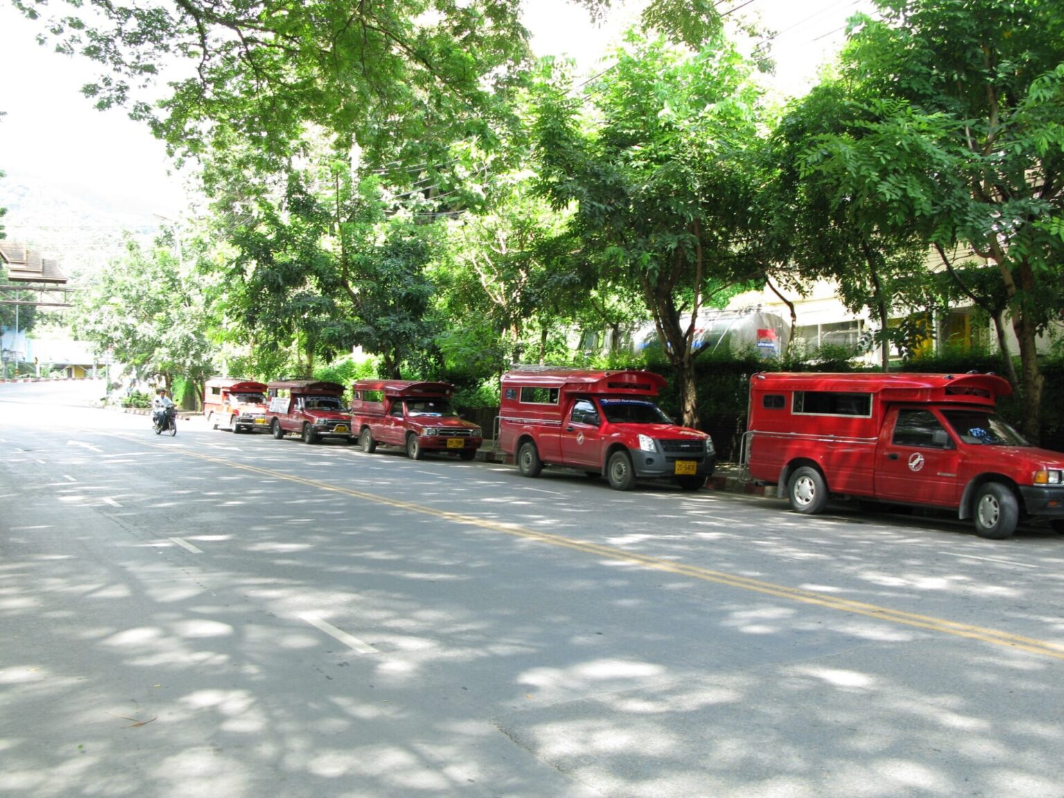 チェンマイでの移動手段として、ソンテウは非常に人気があります。ソンテウは赤や黄色の小型トラックで、市内各所を巡回しています。乗り方は簡単で、手を挙げて停め、目的地を伝えればOKです。