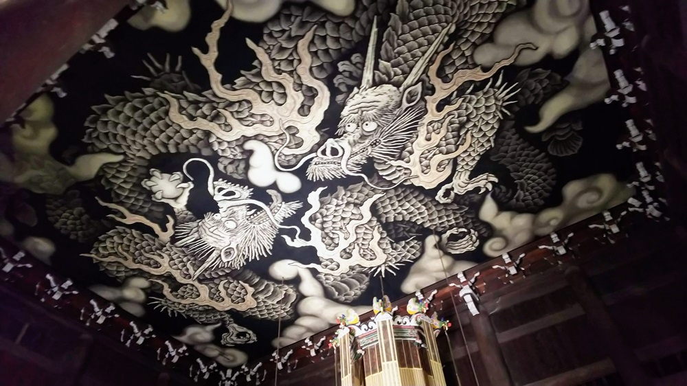 2匹の龍は、一方は口を大きく開け、一方は口を閉じている「阿吽(あうん)」の形をとっています。今にも天井から飛び出してきそうな躍動感ある双龍図は、一見の価値ありです。