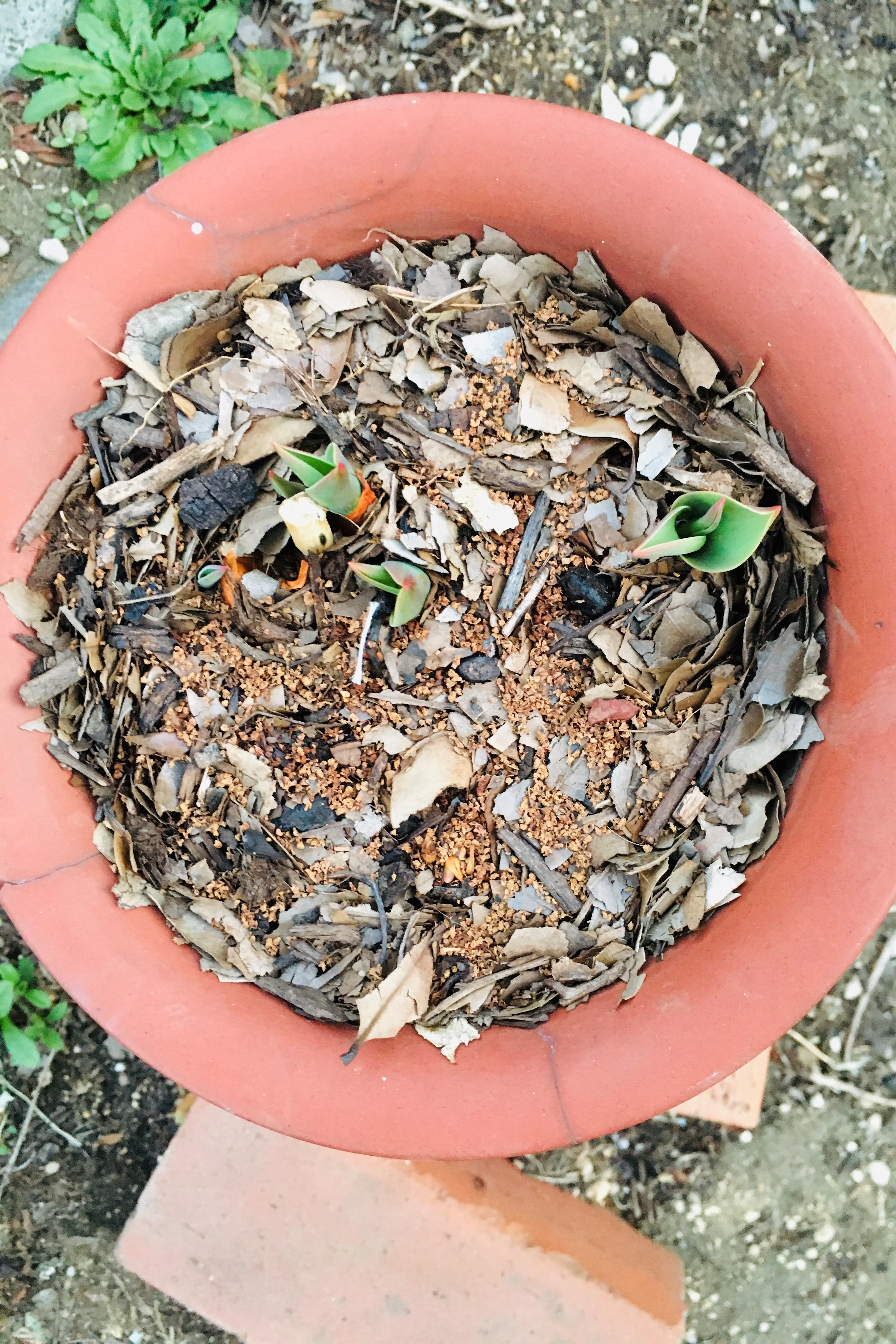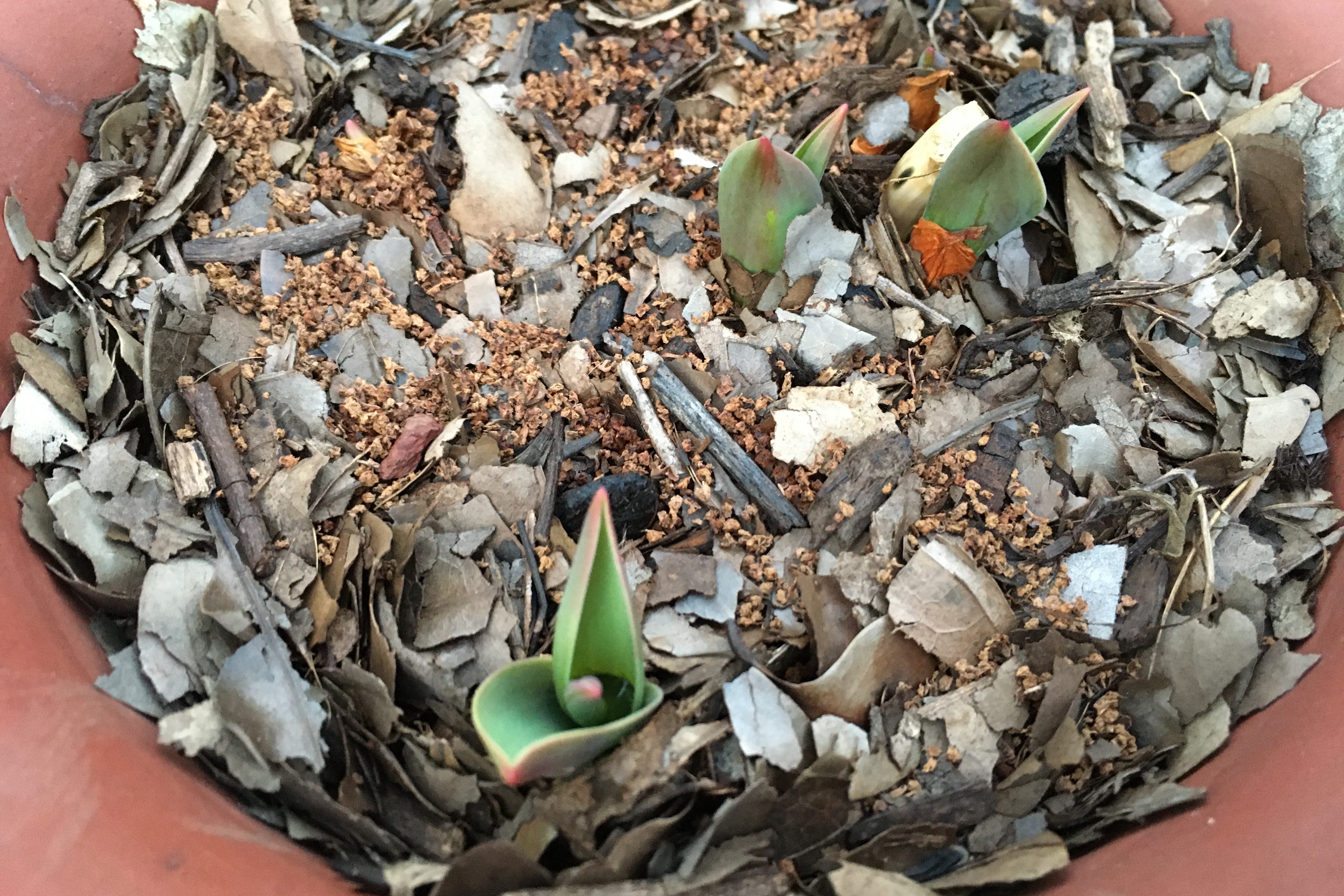 新しい球根に比べると小さかったり痩せているものもあったので心配していましたが、2月も後半になり暖かくなってくると、しっかり芽を出してきてくれました。