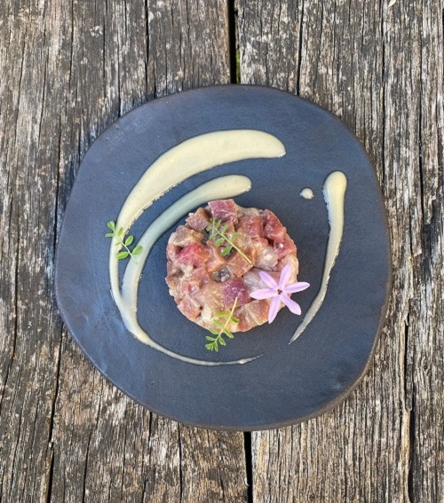 ④「ソバキチ」ビンナガマグロのタルタル、茄子
